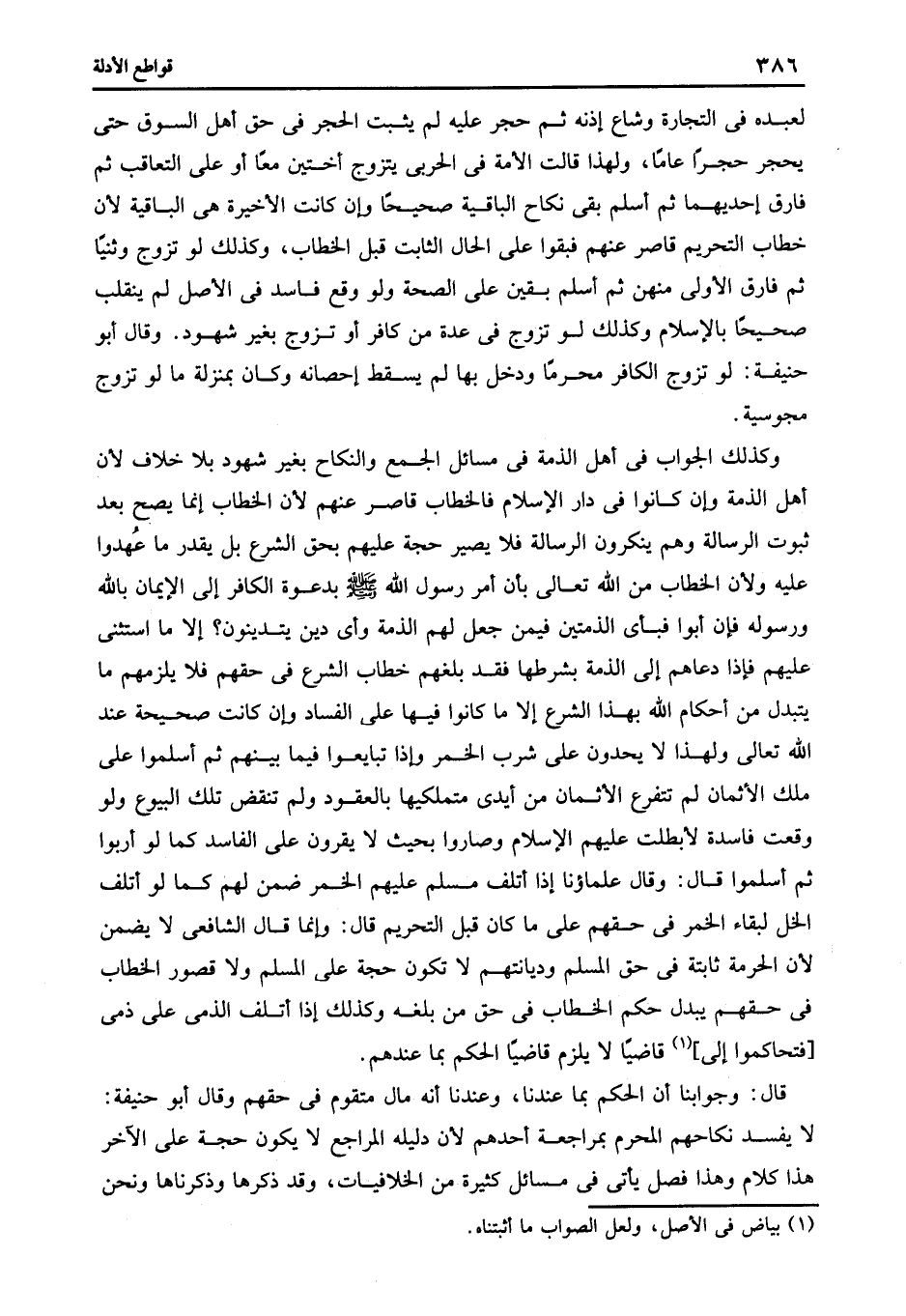 وكذلك الجواب في أهل الذمة في مسائل الجمع والنكاح بغير شهود بلا خلاف لأن أهل الذمة وإن كانوا في دار الإسلام فالخطاب قاصر عنهم لأن الخطاب إنما يصح بعد ثبوت الرسالة وهم ينكرون الرسالة فلا يصير حجة عليهم بحق الشرع بل يقدر ما عهدوا عليه ولأن الخطاب من الله تعالى بأن أمر رسول الله صلى الله عليه وسلم بدعوة الكافر إلى الإيمان بالله ورسوله فإن أبوا فبأى الذمتين فيمن جعل لهم الذمة وأى دين يتدينون؟ إلا ما استثنى عليهم فإذا دعاهم إلى الذمة بشرطها فقد بلغهم خطاب الشرع في حقهم فلا يلزمهم ما يتبدل من أحكام الله بهذا الشرع إلا ما كانوا فيها على الفساد وإن كانت صحيحة عند الله تعالى ولهذا لا يحدون على شرب الخمر وإذا تبايعوا فيما بينهم ثم أسلموا على ملك الأثمان لم تتفرع الأثمان من أيدى متملكيها بالعقود ولم تنقض تلك البيوع ولو وقعت فاسدة لأبطلت عليهم الإسلام وصاروا بحيث لا يقرون على الفاسد كما لو أربوا ثم أسلموا قال: وقال علماؤنا إذا أتلف مسلم عليهم الخمر ضمن لهم كما لو أتلف الخل لبقاء الخمر في حقهم على ما كان قبل التحريم قال: وإنما قال الشافعى لا يضمن لأن الحرمة ثابتة في حق المسلم وديانتهم لا تكون حجة على المسلم ولا قصور الخطاب في حقهم يبدل حكم الخطاب في حق من بلغه وكذلك إذا أتلف الذمى على ذمى [فتحاكموا إلى] 1 قاضيا لا يلزم قاضيا الحكم بما عندهم.