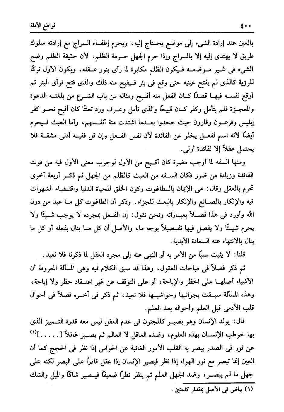 بالعين عند إرادة الشئ إلى موضع يحتاج إليه ويحرم إطفاء السراج مع إرادته سلوك طريق لا يهتدى إليه بالسراج وإذا حرم الجهل حرمة الظلم لأن حقيقة الظلم وضع الشئ في غير موضعه فيكون الظلم مكابرة لما رأى بنور عقله ويكون الأول تركا للرؤية كالذى لم يفتح عينيه حتى وقع في بئر فيقبح منه ذلك والذى فتح فرأى البئر ثم أوقع نفسه فيها قصدا كان الفعل منه أقبح ومثاله من باب الشرع من بلغته الدعوة والمعجزة فلم يتأمل وكفر كان قبيحا والذى تامل وعرف ورد تعنتا كان أقبح نحو كفر إبليس وفرعون وقارون حيث جحدوا بعدما اشتدت منة أنفسهم وأما العبث فيحرم أيضا لأنه اسم لفعل يخلو عن الفائدة لأن نفس الفعل وإن قل ففيه أدنى مشقة فلا يحتمل عقلا إلا لفائدة أولى.