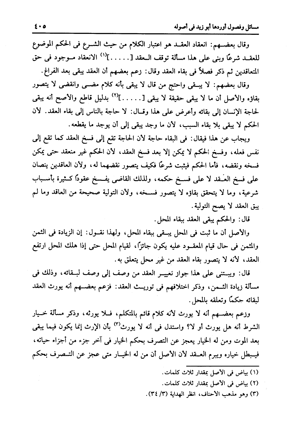 وقال بعضهم: انعقاد العقد هو اعتبار الكلام من حيث الشرع في الحكم الموضوع للعقد شرعا وبنى على هذا مسألة توقف العقد [.....] 1 الانعقاد موجود في حق المتعاقدين ثم ذكر فصلا في بقاء العقد وقال: زعم بعضهم أن العقد يبقى بعد الفراغ.