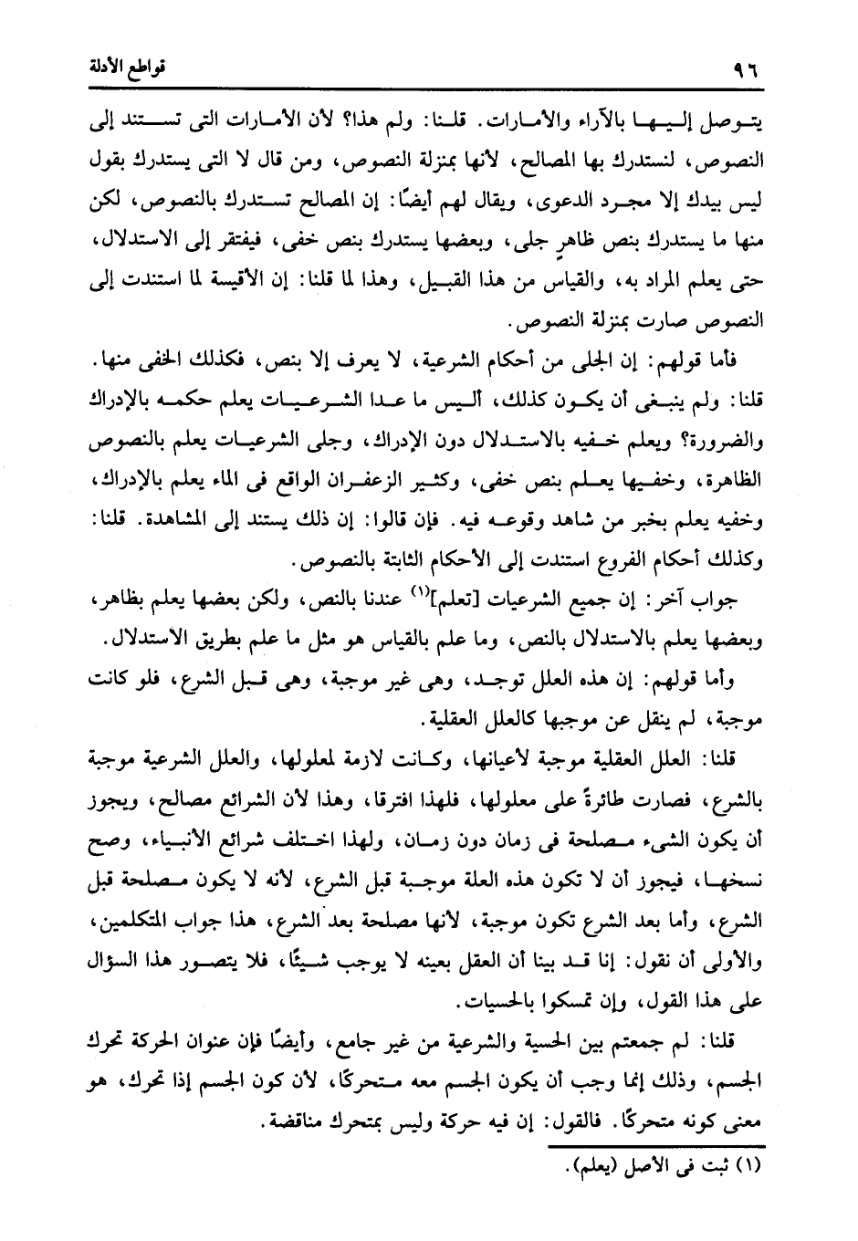 جواب آخر: إن جميع الشرعيات [تعلم] 1 عندنا بالنص ولكن بعضها يعلم بظاهر وبعضها يعلم بالاستدلال بالنص وما علم بالقياس هو مثل ما علم بطريق الاستدلال.