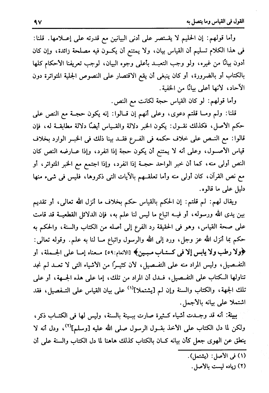 ويقال لهم: لم قلتم: إن الحكم بالقياس حكم بخلاف ما أنزل الله تعالى أو تقديم بين يدى الله ورسوله أو فيه آتباع ما ليس لنا علم به فإن الدلائل القطعية قد قامت على صحة القياس وهو في الحقيقة رد الفرع إلى أصله من الكتاب والسنة والحكم به حكم بما أنزل الله عز وجل ورد إلى الله والرسول واتباع ما لنا به علم. وقوله تعالى: {وَلا رَطْبٍ وَلا يَابِسٍ إِلَّا فِي كِتَابٍ مُبِينٍ} [الأنعام: 59] معناه إما على الجملة أو التفصيل وليس المراد منه على التفصيل لأن كثيرا من الأشياء التي لا تعد لم نجد تناولها الكتاب على التفصيل فدل أن المراد من تلك إما على هذه الجهة أو على تلك الجهة والكتاب والسنة وإن لم [يشتملا] 1 على بيان القياس على التفصيل فقد اشتملا على بيانه بالأجمل