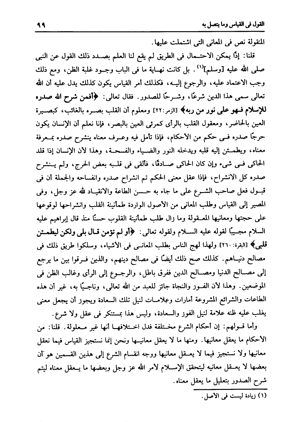 قلنا إذا يمكن الاحتمال في الطريق لم يقع لنا العلم بصدد ذلك القول عن النبى صلى الله عليه [وسلم] 1. بل كانت نهاية ما في الباب وجود غلبة ظنه ومع ذلك وجب الاعتماد عليه والرجوع إليه فكذلك أمر القياس يكون كذلك يدل عليه أن الله تعالى سمى هذا الدين شرعا وشرحا للصدور. فقال تعالى: {أَفَمَنْ شَرَحَ اللَّهُ صَدْرَهُ لِلْإِسْلامِ فَهُوَ عَلَى نُورٍ مِنْ رَبِّهِ} [الزمر: 22] ومعلوم أن القلب بصره بالغائب كبصيرة العين بالحاضر ومعقول القلب بالرأى كمرئى العين بالبصر فإنا نعلم أن الإنسان يكون حرجا صدره في حكم من الأحكام فإذا تأمل فيه وعرف معناه ينشرح صدره بمعرفة معناه ويطمئن إليه قلبه ويدخله النور والضياء والفسحة وهذا لأن الإنسان إذا قلد الحاكى في شئ وإن كان الحاكى صادقا فألقى في قلبه بعض الحرج ولم ينشرح صدره كل الانشراح فإذا عقل معنى الحكم تم انشراح صدره وانفساحه والجملة أن في قبول فعل صاحب الشرع على ما جاء به حسن الطاعة والانقياد لله عز وجل وفى المصير إلى القياس وطلب المعاني من الأصول الواردة طمأنينة القلب وانشراحها لوقوعها على حجتها ومعانيها المعقولة وما زال طلب طمأنينة القلوب حسنا منذ قال إبراهيم عليه السلام مجيبا لقوله صلى الله عليه وسلم ولقوله تعالى: {أَوَلَمْ تُؤْمِنْ قَالَ بَلَى وَلَكِنْ لِيَطْمَئِنَّ قَلْبِي} [البقرة: 260] ولهذا لهج الناس بطلب المعاني في الأشياء وسلكوا طريق ذلك في مصالح دنياهم كذلك صح ذلك أيضا في مصالح دينهم والذين فرقوا بين ما يرجع إلى مصالح الدنيا ومصالح الدين ففرق باطل والرجوع إلى الرأى وغالب الظن في الموضعين. وهذا لأن الفوز والنجاة جائز للعبد من الله تعالى وناجيا به غير أن هذه الطاعات والشرائع المشروعة أمارات وعلامات لنيل تلك السعادة ويجوز أن يجعل معنى يغلب عليه الظن علامة لنيل الفوز والسعادة وليس هذا بمستنكر في عقل ولا شرع.