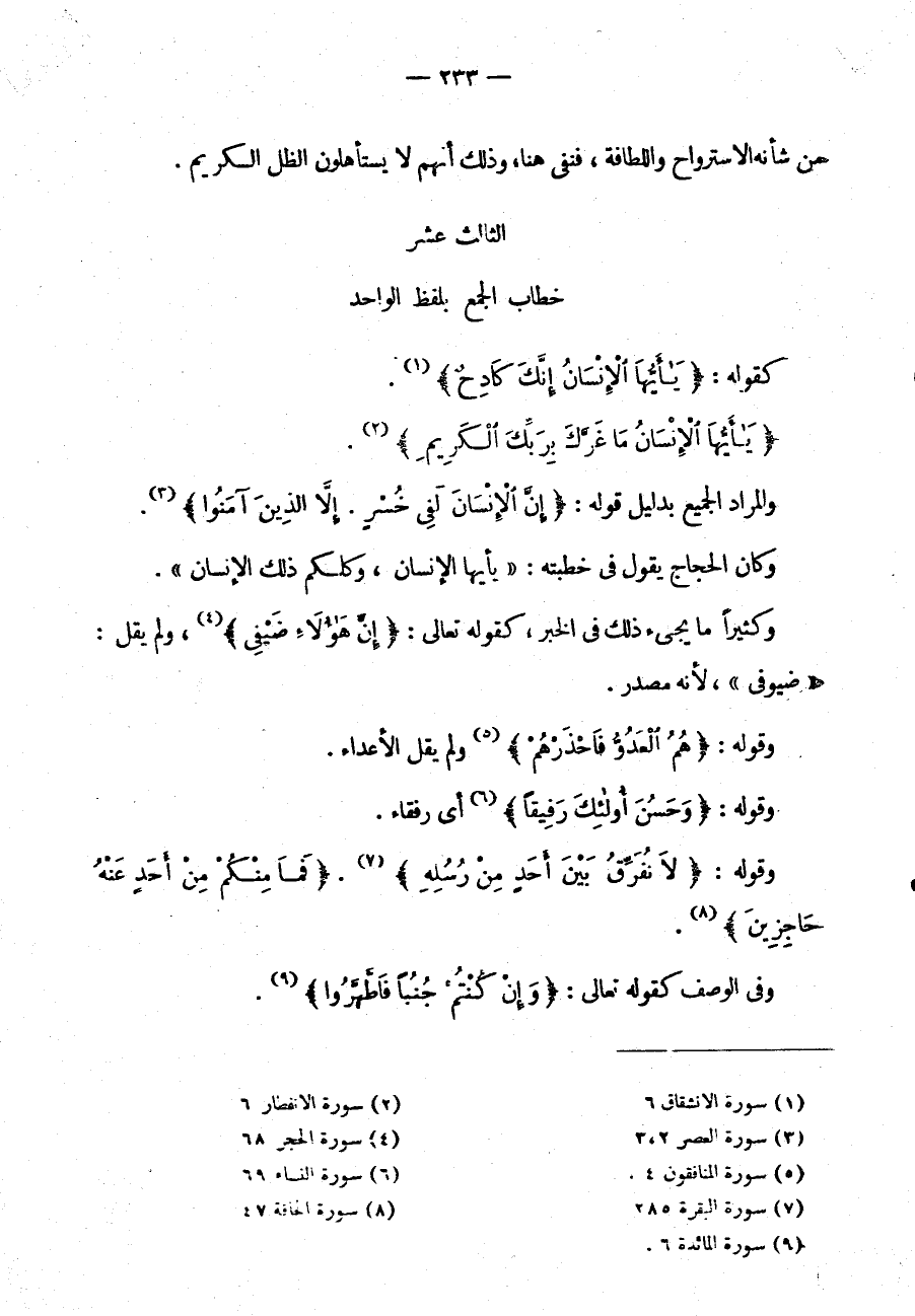 الثَّالِثَ عَشَرَ: خطاب الجمع بلفظ الواحد