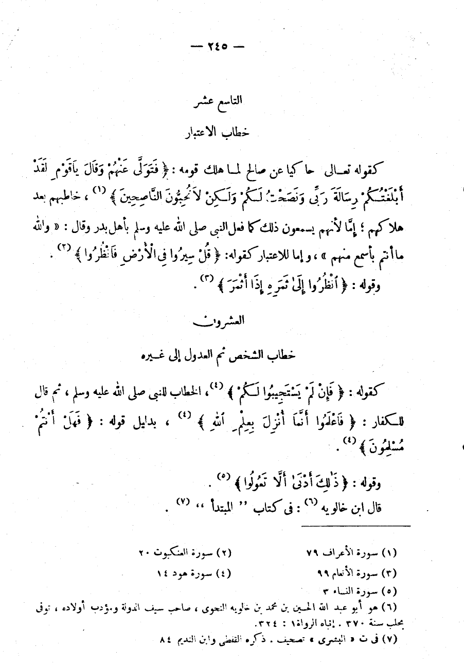 كَقَوْلِهِ تَعَالَى حَاكِيًا عَنْ صَالِحٍ لَمَّا هَلَكَ قَوْمُهُ: {فَتَوَلَّى عَنْهُمْ وقال يا قوم لَقَدْ أَبْلَغْتُكُمْ رِسَالَةَ رَبِّي وَنَصَحْتُ لَكُمْ وَلَكِنْ لا تحبون الناصحين} خَاطَبَهُمْ بَعْدَ هَلَاكِهِمْ إِمَّا لِأَنَّهُمْ يَسْمَعُونَ ذَلِكَ كَمَا فَعَلَ النَّبِيُّ صَلَّى اللَّهُ عَلَيْهِ وَسَلَّمَ بِأَهْلِ بَدْرٍ وَقَالَ: "وَاللَّهِ مَا أَنْتُمْ بِأَسْمَعَ مِنْهُمْ" وَإِمَّا لِلِاعْتِبَارِ كَقَوْلِهِ: {قُلْ سِيرُوا فِي الأرض فانظروا} وقوله: {انظروا إلى ثمره إذا أثمر}