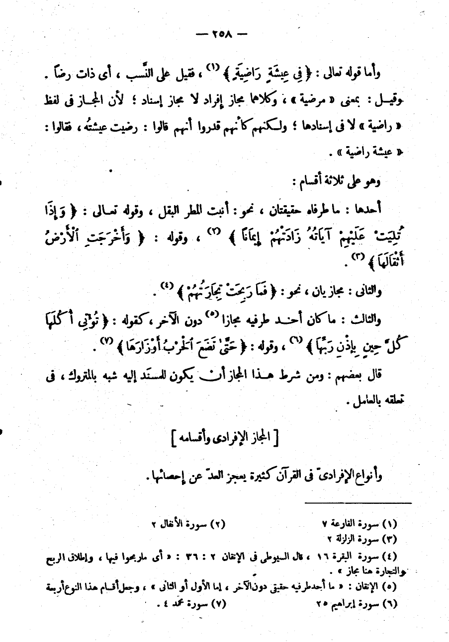 وأما قوله تعالى: {في عيشة راضية} فَقِيلَ: عَلَى النَّسَبِ أَيْ: ذَاتِ رِضًا وَقِيلَ: بِمَعْنَى مَرْضِيَّةٍ وَكِلَاهُمَا مَجَازُ إِفْرَادٍ لَا مَجَازَ إِسْنَادٍ لِأَنَّ الْمَجَازَ فِي لَفْظِ رَاضِيَةٍ لَا فِي إِسْنَادِهَا وَلَكِنَّهُمْ كَأَنَّهُمْ قَدَّرُوا أَنَّهُمْ قَالُوا: رَضِيَتْ عِيشَتُهُ فَقَالُوا: عِيشَةٌ رَاضِيَةٌ