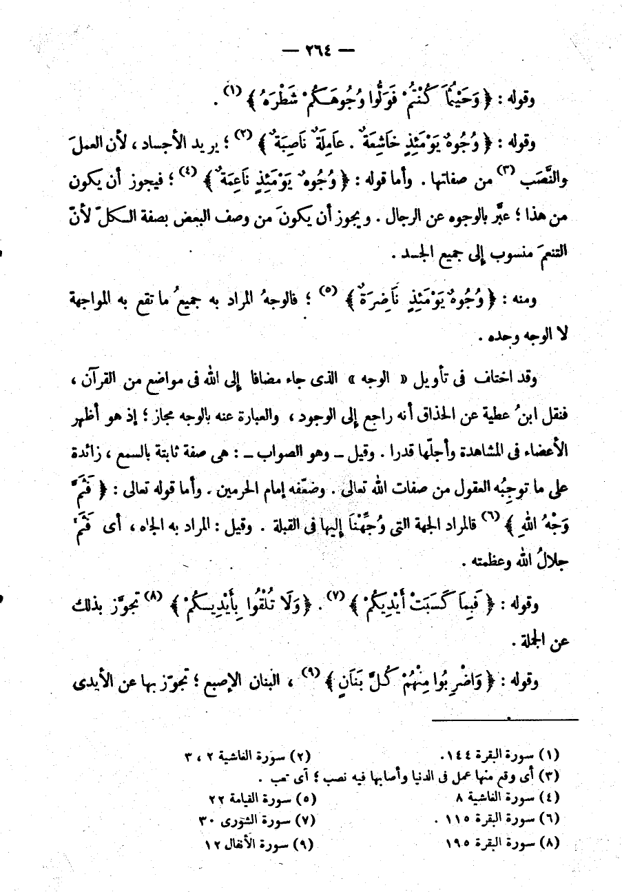 وَقَدِ اخْتُلِفَ فِي تَأْوِيلِ "الْوَجْهِ" الَّذِي جَاءَ مُضَافًا إِلَى اللَّهِ فِي مَوَاضِعَ مِنَ الْقُرْآنِ فَنَقَلَ ابْنُ عَطِيَّةَ عَنِ الْحُذَّاقِ أَنَّهُ رَاجِعٌ إِلَى الْوُجُودِ وَالْعِبَارَةُ عَنْهُ بِالْوَجْهِ مَجَازٌ إِذْ هُوَ أَظْهَرُ الْأَعْضَاءِ في الْمُشَاهَدَةِ وَأَجَلُّهَا قَدْرًا وَقِيلَ -وَهُوَ الصَّوَابُ-: هِيَ صِفَةٌ ثَابِتَةٌ بِالسَّمْعِ زَائِدَةٌ عَلَى مَا تُوجِبُهُ الْعُقُولُ مِنْ صِفَاتِ اللَّهِ تَعَالَى وَضَعَّفَهُ إِمَامُ الْحَرَمَيْنِ وَأَمَّا قَوْلُهُ تَعَالَى: {فَثَمَّ وَجْهُ اللَّهِ} فَالْمُرَادُ الْجِهَةُ الَّتِي وُجِّهْنَا إِلَيْهَا فِي الْقِبْلَةِ وَقِيلَ: الْمُرَادُ بِهِ الْجَاهُ أَيْ فَثَمَّ جَلَالُ الله وعظمته