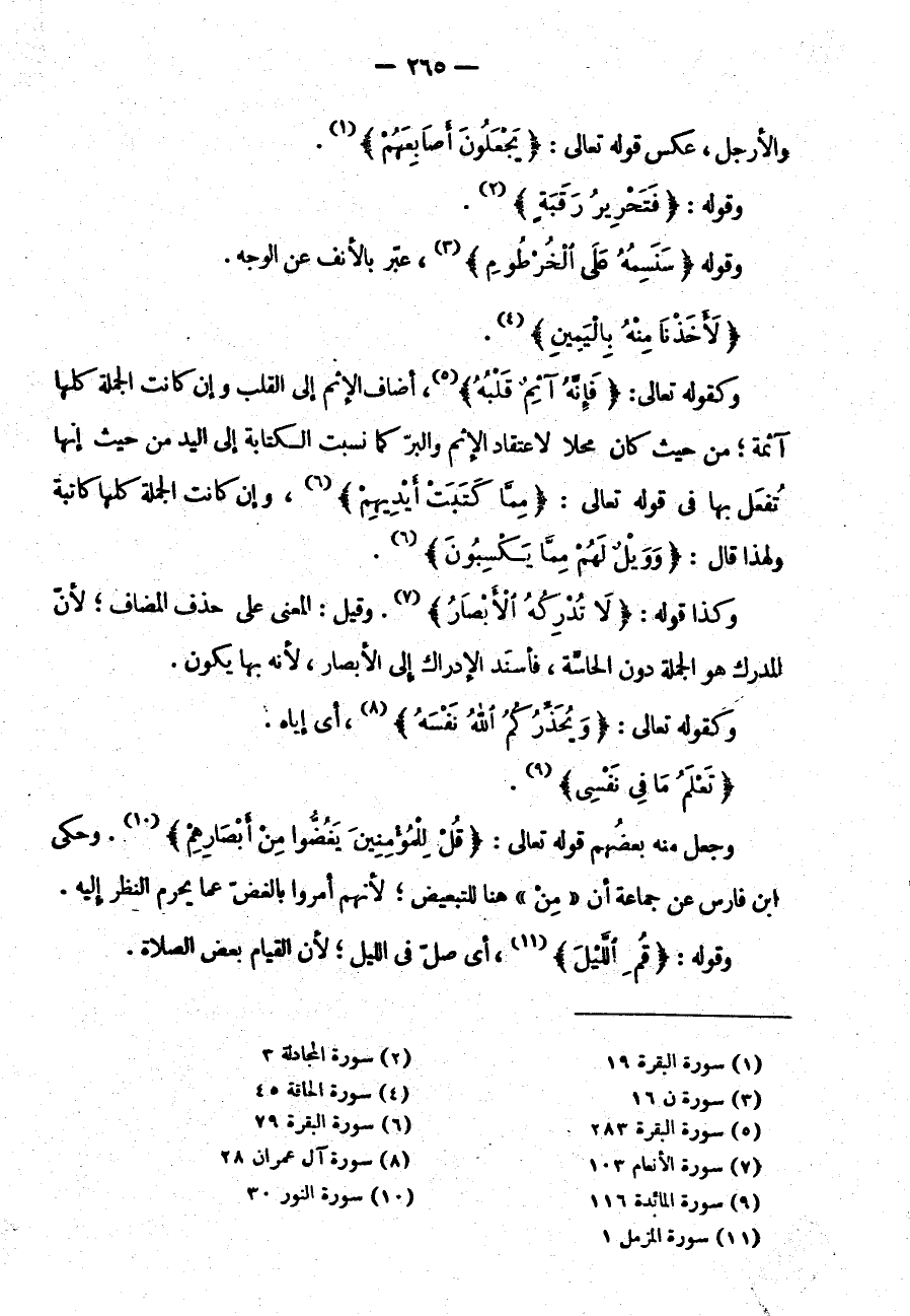 وكقوله تعالى: {فإنه آثم قلبه} أَضَافَ الْإِثْمَ إِلَى الْقَلْبِ وَإِنْ كَانَتِ الْجُمْلَةُ كُلُّهَا آثِمَةً مِنْ حَيْثُ كَانَ مَحَلًّا لِاعْتِقَادِ الْإِثْمِ وَالْبِرِّ كَمَا نُسِبَتِ الْكِتَابَةُ إِلَى الْيَدِ مِنْ حَيْثُ إِنَّهَا تُفْعَلُ بِهَا فِي قَوْلِهِ تعالى: {مما كتبت أيديهم} وَإِنْ كَانَتِ الْجُمْلَةُ كُلُّهَا كَاتِبَةً وَلِهَذَا قَالَ: {وويل لهم مما يكسبون}