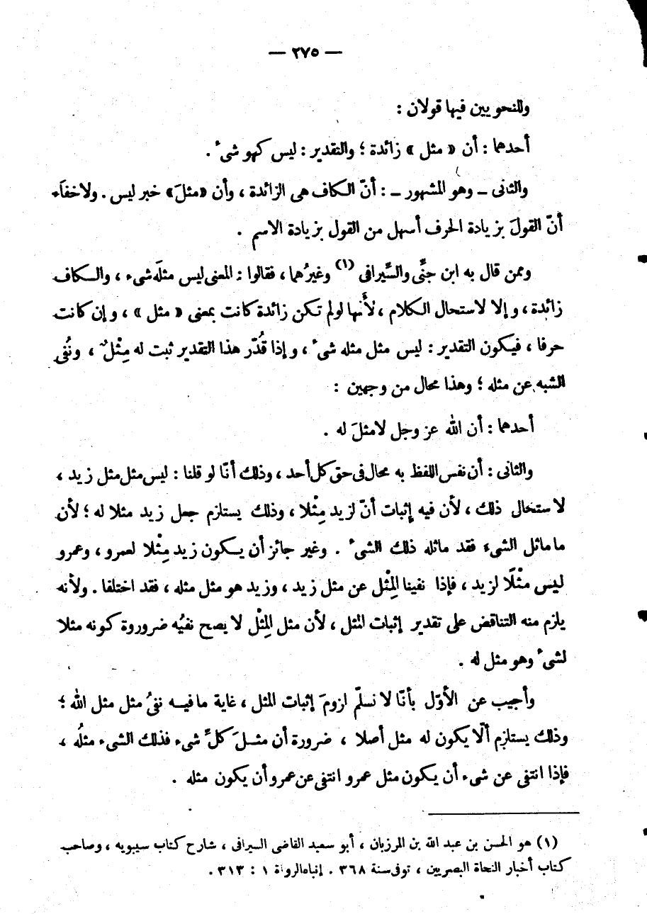 وَالثَّانِي: أَنَّ نَفْسَ اللَّفْظِ بِهِ مُحَالٌ فِي حَقِّ كُلِّ أَحَدٍ وَذَلِكَ أَنَا لَوْ قُلْنَا: لَيْسَ مِثْلٌ مِثْلَ زَيْدٍ لَاسْتَحَالَ ذَلِكَ لِأَنَّ فِيهِ إِثْبَاتُ أَنَّ لِزَيْدٍ مِثْلًا وَذَلِكَ يَسْتَلْزِمُ جَعْلَ زَيْدٍ مِثْلًا لَهُ لِأَنَّ مَا مَاثَلَ الشَّيْءَ فَقَدْ مَاثَلَهُ ذَلِكَ الشَّيْءُ وَغَيْرُ جَائِزٍ أَنْ يَكُونَ زَيْدٌ مِثْلًا لِعَمْرٍو وَعَمْرٌو لَيْسَ مِثْلًا لِزَيْدٍ فَإِذَا نَفَيْنَا الْمِثْلَ عَنْ مِثْلِ زَيْدٍ وَزَيْدٌ هُوَ مِثْلُ مِثْلِهِ فَقَدِ اخْتَلَفْنَا وَلِأَنَّهُ يلزم منه التناقص عَلَى تَقْدِيرِ إِثْبَاتِ الْمِثْلِ لِأَنَّ مِثْلَ الْمِثْلِ لا يَصِحُّ نَفْيُهُ ضَرُورَةَ كَوْنِهِ مِثْلًا لِشَيْءٍ وَهُوَ مِثْلٌ لَهُ