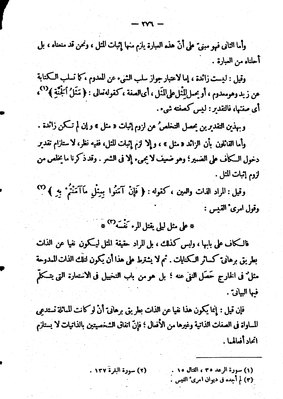 وَأَمَّا الْقَائِلُونَ بِأَنَّ الزَّائِدَ مِثْلٌ وَإِلَّا لَزِمَ إِثْبَاتُ الْمِثْلِ فَفِيهِ نَظَرٌ لِاسْتِلْزَامِ تَقْدِيرِ دُخُولِ الْكَافِ عَلَى الضَّمِيرِ وَهُوَ ضَعِيفٌ لَا يَجِيءُ إِلَّا فِي الشِّعْرِ وَقَدْ ذَكَرْنَا مَا يَخْلُصُ مِنْ لُزُومِ إِثْبَاتِ الْمِثْلِ