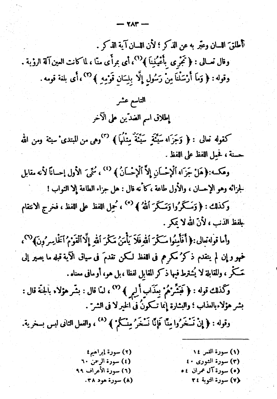 وَأَمَّا قَوْلُهُ تَعَالَى: {أَفَأَمِنُوا مَكْرَ اللَّهِ فَلَا يَأْمَنُ مَكْرَ الله إلا القوم الخاسرون} فَهُوَ وَإِنْ لَمْ يَتَقَدَّمْ ذِكْرُ مَكْرِهِمْ فِي اللَّفْظِ لَكِنْ تَقَدَّمَ فِي سِيَاقِ الْآيَةِ قَبْلَهُ مَا يَصِيرُ إِلَى مَكْرٍ وَالْمُقَابَلَةُ لَا يُشْتَرَطُ فِيهَا ذِكْرُ الْمُقَابِلِ لَفْظًا بَلْ هُوَ أَوْ مَا فِي مَعْنَاهُ