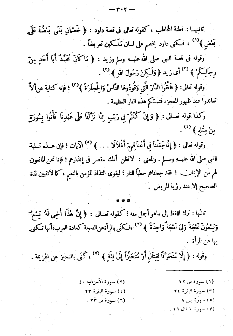 ثَالِثُهَا: تَرْكُ اللَّفْظِ إِلَى مَا هُوَ أَجْمَلُ مِنْهُ كَقَوْلِهِ تَعَالَى: {إِنَّ هَذَا أَخِي لَهُ تِسْعٌ وَتِسْعُونَ نعجة ولي نعجة واحدة} فكنى بالمرأة عن النعجة كَعَادَةِ الْعَرَبِ أَنَّهَا تُكَنِّي بِهَا عَنِ الْمَرْأَةِ