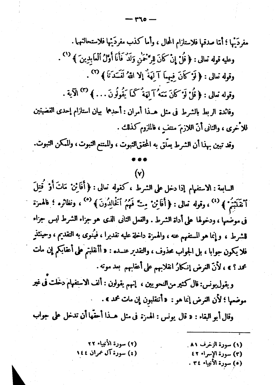 السَّابِعَةُ: الِاسْتِفْهَامُ إِذَا دَخَلَ عَلَى الشَّرْطِ كَقَوْلِهِ تَعَالَى: {أَفَإِنْ مات أو قتل انقلبتم} وقوله تعالى: {أفإن مت فهم الخالدون} وَنَظَائِرُهُ فَالْهَمْزَةُ فِي مَوْضِعِهَا وَدُخُولُهَا عَلَى أَدَاةِ الشَّرْطِ وَالْفِعْلُ الثَّانِي الَّذِي هُوَ جَزَاءُ الشَّرْطِ لَيْسَ جَزَاءً لِلشَّرْطِ وَإِنَّمَا هُوَ الْمُسْتَفْهَمُ عَنْهُ وَالْهَمْزَةُ دَاخِلَةٌ عَلَيْهِ تَقْدِيرًا فَيُنْوَى بِهِ التَّقْدِيمُ وَحِينَئِذٍ فَلَا يَكُونُ جَوَابًا بَلِ الْجَوَابُ مَحْذُوفٌ وَالتَّقْدِيرُ عِنْدَهُ: "أَأَنْقَلَبْتُمْ عَلَى أَعْقَابِكُمْ أَنْ مَاتَ مُحَمَّدٌ"؟ لِأَنَّ الْغَرَضَ إِنْكَارُ انْقِلَابِهِمْ عَلَى أَعْقَابِهِمْ بَعْدَ مَوْتِهِ