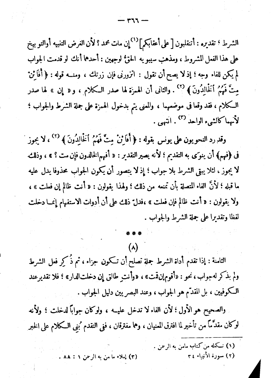 وَالصَّحِيحُ هُوَ الْأَوَّلُ لِأَنَّ الْفَاءَ لَا تَدْخُلُ عَلَيْهِ وَلَوْ كَانَ جَوَابًا لَدَخَلَتْ وَلِأَنَّهُ لَوْ كَانَ مُقَدَّمًا مِنْ تَأْخِيرٍ لَمَا افْتَرَقَ الْمَعْنِيَّانِ وَهُمَا مُفْتَرِقَانِ فَفِي التَّقَدُّمِ بُنِيَ الْكَلَامُ عَلَى الْخَبَرِ