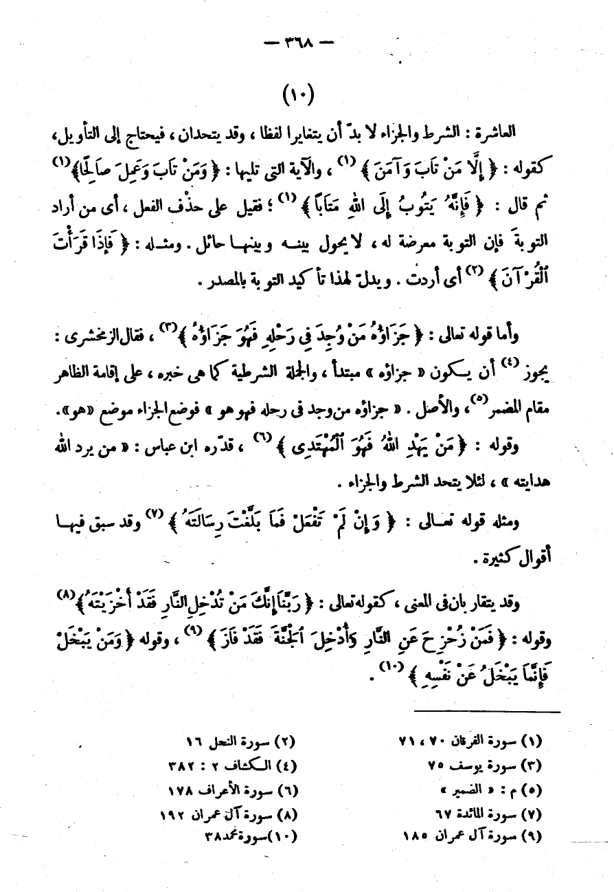 العاشرة: الشرط والجزاء لابد أن يتغاير لَفْظًا وَقَدْ يَتَّحِدَانِ فَيُحْتَاجُ إِلَى التَّأْوِيلِ كَقَوْلِهِ: {إلا من تاب وآمن} والآية التي تليها: {من تاب وعمل صالحا} ثُمَّ قَالَ: {فَإِنَّهُ يَتُوبُ إِلَى اللَّهِ مَتَابًا} فَقِيلَ عَلَى حَذْفِ الْفِعْلِ أَيْ مَنْ أَرَادَ التَّوْبَةَ فَإِنَّ التَّوْبَةَ مُعْرِضَةٌ لَهُ لَا يَحُولُ بينه بينها حائل ومثله: {فإذا قرأت القرآن} أَيْ: أَرَدْتَ وَيَدُلُّ لِهَذَا تَأْكِيدُ التَّوْبَةِ بِالْمَصْدَرِ