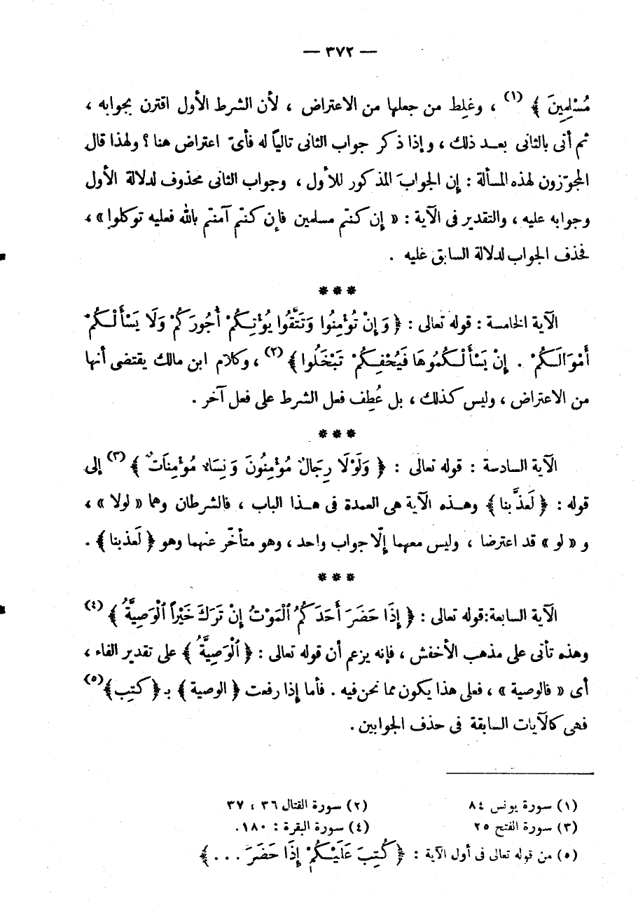 الْآيَةُ الْخَامِسَةُ: قَوْلُهُ تَعَالَى: {وَإِنْ تُؤْمِنُوا وَتَتَّقُوا يُؤْتِكُمْ أُجُورَكُمْ وَلَا يَسْأَلْكُمْ أَمْوَالَكُمْ. إِنْ يسألكموها فيحفكم تبخلوا} وَكَلَامُ ابْنِ مَالِكٍ يَقْتَضِي أَنَّهَا مِنَ الِاعْتِرَاضِ وليس كذلك بل عطف هل الشَّرْطِ عَلَى فِعْلٍ آخَرَ