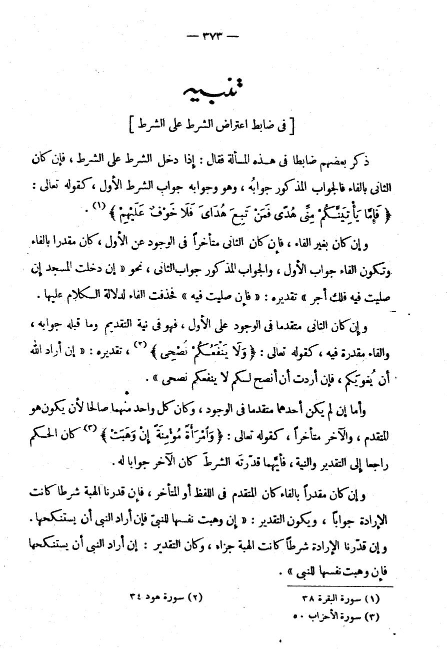 وَأَمَّا إِنْ لَمْ يَكُنْ أَحَدُهُمَا مُتَقَدِّمًا فِي الْوُجُودِ وَكَانَ كُلُّ وَاحِدٍ مِنْهُمَا صَالِحًا لِأَنْ يَكُونَ هُوَ الْمُتَقَدِّمَ وَالْآخَرُ مُتَأَخِّرًا كَقَوْلِهِ تَعَالَى: {وامرأة مؤمنة إن وهبت} كَانَ الْحُكْمُ رَاجِعًا إِلَى التَّقْدِيرِ وَالنِّيَّةِ فَأَيُّهُمَا قَدَّرْتَهُ الشَّرْطَ كَانَ الْآخَرُ جَوَابًا لَهُ