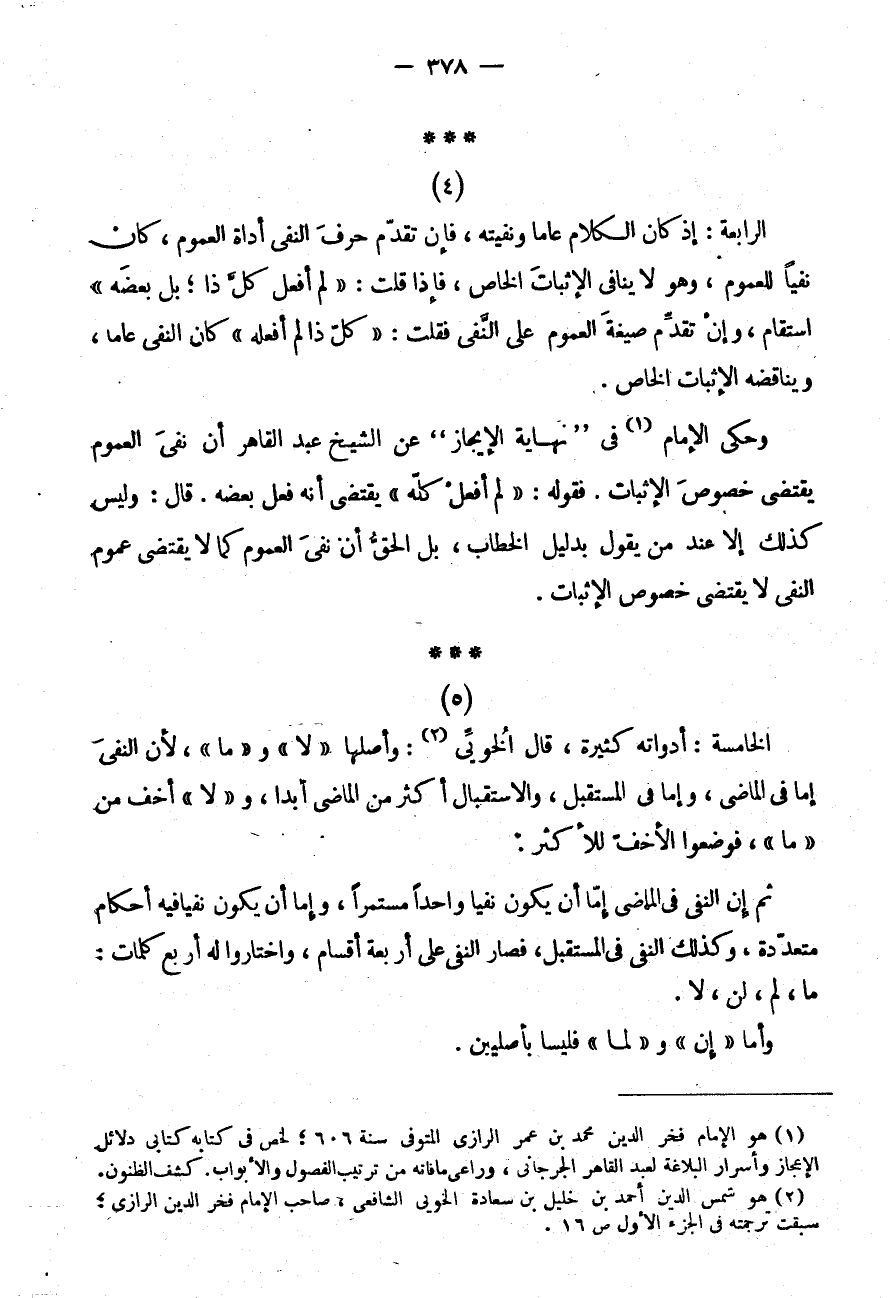 ثُمَّ إِنَّ النَّفْيَ فِي الْمَاضِي إِمَّا أَنْ يَكُونَ نَفْيًا وَاحِدًا مُسْتَمِرًّا وَإِمَّا أَنْ يَكُونَ نَفْيًا فِيهِ أَحْكَامٌ مُتَعَدِّدَةٌ وَكَذَلِكَ النَّفْيُ فِي الْمُسْتَقْبَلِ فَصَارَ النَّفْيُ عَلَى أَرْبَعَةِ أَقْسَامٍ وَاخْتَارُوا لَهُ أَرْبَعَ كَلِمَاتٍ: مَا، لَمْ، لَنْ، لَا
