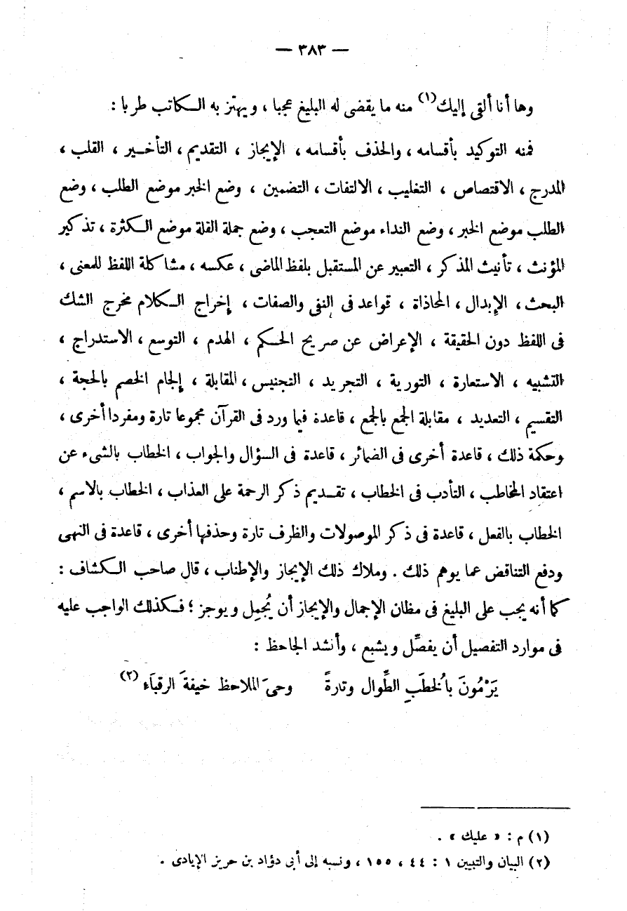 فَمِنْهُ التَّوْكِيدُ بِأَقْسَامِهِ وَالْحَذْفُ بِأَقْسَامِهِ الْإِيجَازُ التَّقْدِيمُ وَالتَّأْخِيرُ الْقَلْبُ الْمُدْرَجُ الِاقْتِصَاصُ التَّرَقِّي التَّغْلِيبُ الِالْتِفَاتُ التَّضْمِينُ وَضْعُ الْخَبَرِ مَوْضِعَ الطَّلَبِ وَضْعُ الطَّلَبِ مَوْضِعَ الْخَبَرِ وَضْعُ النِّدَاءِ مَوْضِعَ التَّعَجُّبِ وَضْعُ جُمْلَةِ الْقِلَّةِ مَوْضِعَ الْكَثْرَةِ تَذْكِيرُ الْمُؤَنَّثِ تَأْنِيثُ الْمُذَكِّرِ التَّعْبِيرُ عَنِ الْمُسْتَقْبَلِ بِلَفْظِ الْمَاضِي عَكْسُهُ مُشَاكَلَةُ اللَّفْظِ لِلْمَعْنَى النَّحْتُ الْإِبْدَالُ الْمُحَاذَاةُ قَوَاعِدُ فِي النَّفْيِ وَالصِّفَاتِ إِخْرَاجُ الْكَلَامِ مُخْرَجَ الشَّكِّ فِي اللَّفْظِ دُونَ الْحَقِيقَةِ الْإِعْرَاضُ عَنْ صَرِيحِ الْحُكْمِ الْهَدْمُ التَّوَسُّعُ الِاسْتِدْرَاجُ التَّشْبِيهُ الِاسْتِعَارَةُ التَّوْرِيَةُ التَّجْرِيدُ التَّجْنِيسُ الطِّبَاقُ الْمُقَابَلَةُ إِلْجَامُ الْخَصْمِ بِالْحُجَّةِ التَّقْسِيمُ التَّعْدِيدُ مُقَابَلَةُ الْجَمْعِ بِالْجَمْعِ قَاعِدَةٌ فِيمَا وَرَدَ فِي الْقُرْآنِ مَجْمُوعًا تَارَةً وَمُفْرَدًا أُخْرَى وَحِكْمَةُ ذَلِكَ قَاعِدَةٌ أُخْرَى فِي الضَّمَائِرِ قَاعِدَةٌ فِي السُّؤَالِ وَالْجَوَابِ الْخِطَابُ بِالشَّيْءِ عَنِ اعْتِقَادِ الْمُخَاطَبِ التَّأَدُّبُ فِي الْخِطَابِ تَقْدِيمُ ذِكْرِ الرَّحْمَةِ عَلَى الْعَذَابِ الْخِطَابُ بِالِاسْمِ الْخِطَابُ بِالْفِعْلِ قَاعِدَةٌ فِي ذِكْرِ الْمَوْصُولَاتِ وَالظَّرْفِ تَارَةً وَحَذْفِهَا أُخْرَى قَاعِدَةٌ فِي النَّهْيِ وَدَفْعِ التَّنَاقُضِ عَمَّا يُوهِمُ ذَلِكَ وَمِلَاكُ ذَلِكَ الْإِيجَازُ وَالْإِطْنَابُ قَالَ صَاحِبُ الْكَشَّافِ كَمَا أَنَّهُ يَجِبُ عَلَى الْبَلِيغِ فِي مَظَانِّ الْإِجْمَالِ وَالْإِيجَازِ أَنْ يُجْمِلَ وَيُوجِزَ فَكَذَلِكَ الْوَاجِبُ عَلَيْهِ فِي مَوَارِدِ التَّفْصِيلِ أَنْ يُفَصِّلَ وَيُشْبِعَ وَأَنْشَدَ الْجَاحِظُ: