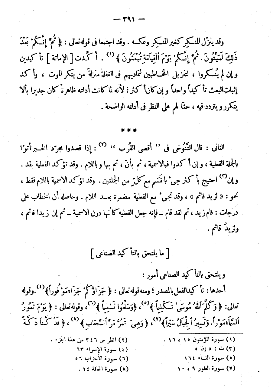 أَحَدُهَا: تَأْكِيدُ الْفِعْلِ بِالْمَصْدَرِ وَمِنْهُ قَوْلُهُ تَعَالَى: {جَزَاؤُكُمْ جَزَاءً مَوْفُورًا} وقوله تعالى: {وكلم الله موسى تكليما} {وسلموا تسليما} وَقَوْلُهُ تَعَالَى: {يَوْمَ تَمُورُ السَّمَاءُ مَوْرًا. وَتَسِيرُ الجبال سيرا} {وهي تمر مر السحاب}