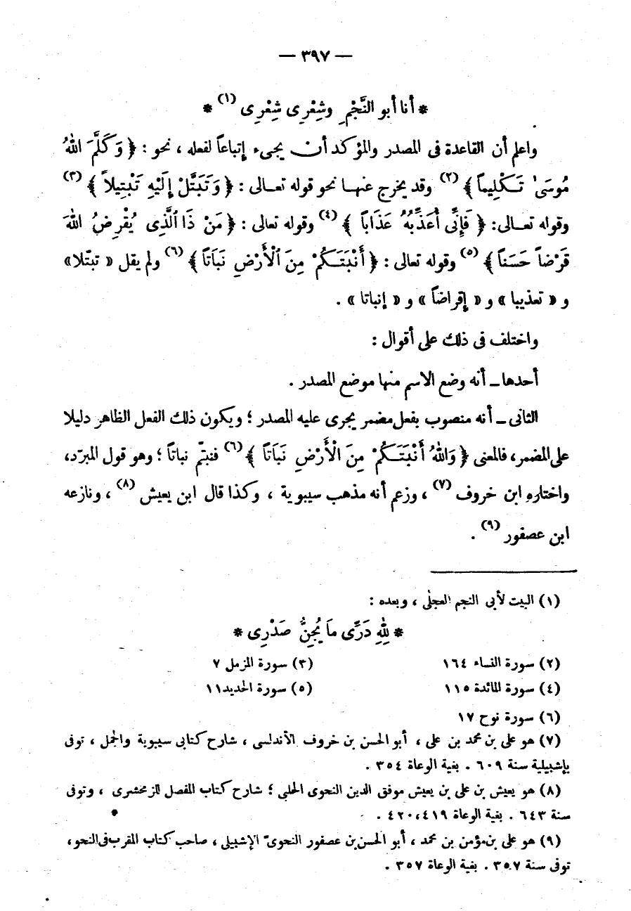 وَاعْلَمْ أَنَّ القاعدة في المصدر والمؤكدأن يَجِيءَ اتِّبَاعًا لِفِعْلِهِ نَحْوُ: {وَكَلَّمَ اللَّهُ مُوسَى تكليما} وَقَدْ يَخْرُجُ عَنْهَا نَحْوُ قَوْلِهِ تَعَالَى: {وَتَبَتَّلْ إليه تبتيلا} وقوله تعالى: {فإني أعذبه عذابا} وَقَوْلِهِ تَعَالَى: {مَنْ ذَا الَّذِي يُقْرِضُ اللَّهَ قَرْضًا حَسَنًا} وقوله تعالى: {أنبتكم من الأرض نباتا} ولم يقل: "تبتلا" و"تعذيبا" و"إقراضا" و"إنباتا"