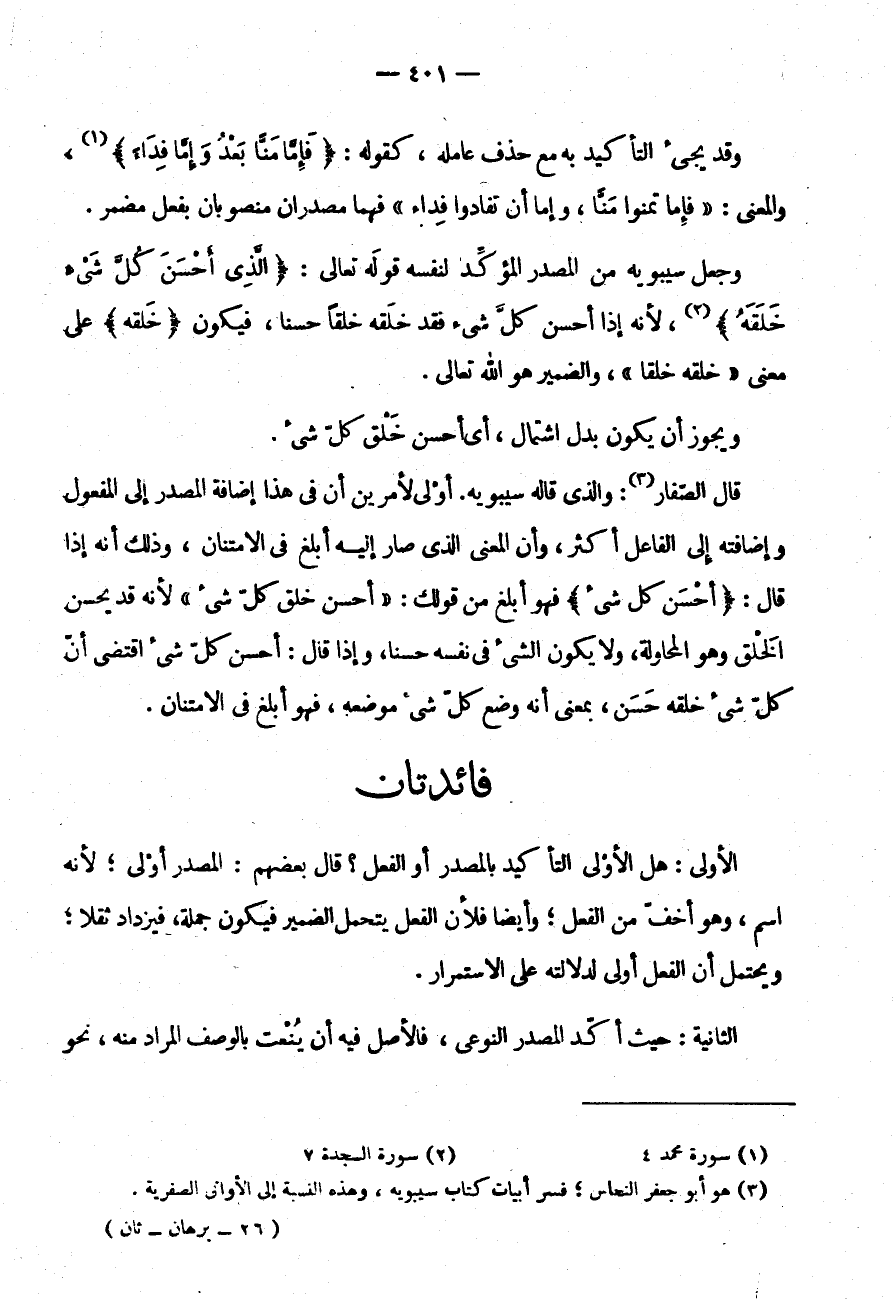 قَالَ الصَّفَّارُ: وَالَّذِي قَالَهُ سِيبَوَيْهِ أَوْلَى لِأَمْرَيْنِ: أَنَّ فِي هَذَا إِضَافَةَ الْمَصْدَرِ إِلَى الْمَفْعُولِ وَإِضَافَتُهُ إِلَى الْفَاعِلِ أَكْثَرُ وَأَنَّ الْمَعْنَى الَّذِي صَارَ إِلَيْهِ أَبْلَغُ فِي الِامْتِنَانِ وَذَلِكَ أَنَّهُ إِذَا قَالَ: {أَحْسَنَ كُلَّ شَيْءٍ} فَهُوَ أَبْلَغُ مِنْ قَوْلِكَ: "أَحْسَنَ خَلْقَ كُلَّ شَيْءٍ" لِأَنَّهُ قَدْ يُحْسِنُ الْخَلْقَ وَهُوَ الْمُحَاوَلَةُ وَلَا يَكُونُ الشَّيْءُ فِي نَفْسِهِ حَسَنًا وَإِذَا قَالَ أَحْسَنَ كُلَّ شَيْءٍ اقْتَضَى أَنَّ كُلَّ شَيْءٍ خَلَقَهُ حَسَنٌ بِمَعْنَى أَنَّهُ وَضَعَ كُلَّ شَيْءٍ مَوْضِعَهُ فَهُوَ أَبْلَغُ فِي الِامْتِنَانِ