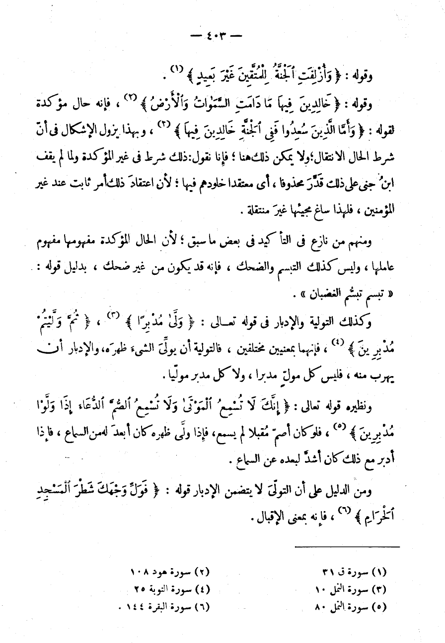 وَكَذَلِكَ التَّوْلِيَةُ والإدبار في قوله تعالى: {ولى مدبرا} {ثم وليتم مدبرين} فَإِنَّهُمَا بِمَعْنَيَيْنِ مُخْتَلِفِينَ فَالتَّوْلِيَةُ أَنْ يُوَلِّيَ الشَّيْءَ ظَهْرَهُ وَالْإِدْبَارُ أَنْ يَهْرَبَ مِنْهُ فَلَيْسَ كُلُّ مُوَلٍّ مُدْبِرًا وَلَا كُلُّ مُدْبِرٍ مُوَلِّيًا وَنَظِيرُهُ قَوْلُهُ تَعَالَى: {إِنَّكَ لَا تُسْمِعُ الْمَوْتَى وَلَا تسمع الصم الدعاء إذا ولوا مدبرين} فَلَوْ كَانَ أَصَمَّ مُقْبِلًا لَمْ يَسْمَعْ فَإِذَا وَلَّى ظَهْرَهُ كَانَ أَبْعَدَ لَهُ مِنَ السَّمَاعِ فَإِذَا أَدْبَرَ مَعَ ذَلِكَ كَانَ أَشَدَّ لِبُعْدِهِ عَنِ السَّمَاعِ وَمِنَ الدَّلِيلِ عَلَى أَنَّ التَّوَلِّيَ لَا يَتَضَمَّنُ الْإِدْبَارَ قَوْلُهُ: {فَوَلِّ وَجْهَكَ شَطْرَ المسجد الحرام} فإنه بمعنى الإقبال