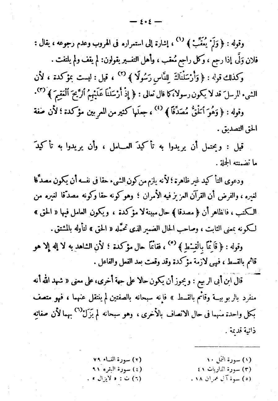 وقوله: {ولم يعقب} إِشَارَةٌ إِلَى اسْتِمْرَارِهِ فِي الْهُرُوبِ وَعَدَمِ رُجُوعِهِ يُقَالُ: فُلَانٌ وَلَّى إِذَا رَجَعَ وَكُلُّ رَاجِعٍ مُعَقِّبٌ وَأَهْلُ التَّفْسِيرِ يَقُولُونَ: لَمْ يَقِفْ وَلَمْ يلتفت وكذلك قوله: {وأرسلناك للناس رسولا} قِيلَ: لَيْسَتْ بِمُؤَكَّدَةٍ لِأَنَّ الشَّيْءَ الْمُرْسَلَ قَدْ لَا يَكُونُ رَسُولًا كَمَا قَالَ تَعَالَى: {إِذْ أرسلنا عليهم الريح العقيم} وقوله: {وهو الحق مصدقا} جَعَلَهَا كَثِيرٌ مِنَ الْمُعْرِبِينَ مُؤَكَّدَةً لِأَنَّ صِفَةَ الْحَقِّ التَّصْدِيقُ قِيلَ وَيُحْتَمَلُ أَنْ يُرِيدُوا بِهِ تَأْكِيدَ الْعَامِلِ وَأَنْ يُرِيدُوا بِهِ تَأْكِيدَ مَا تَضَمَّنَتْهُ الْجُمْلَةُ