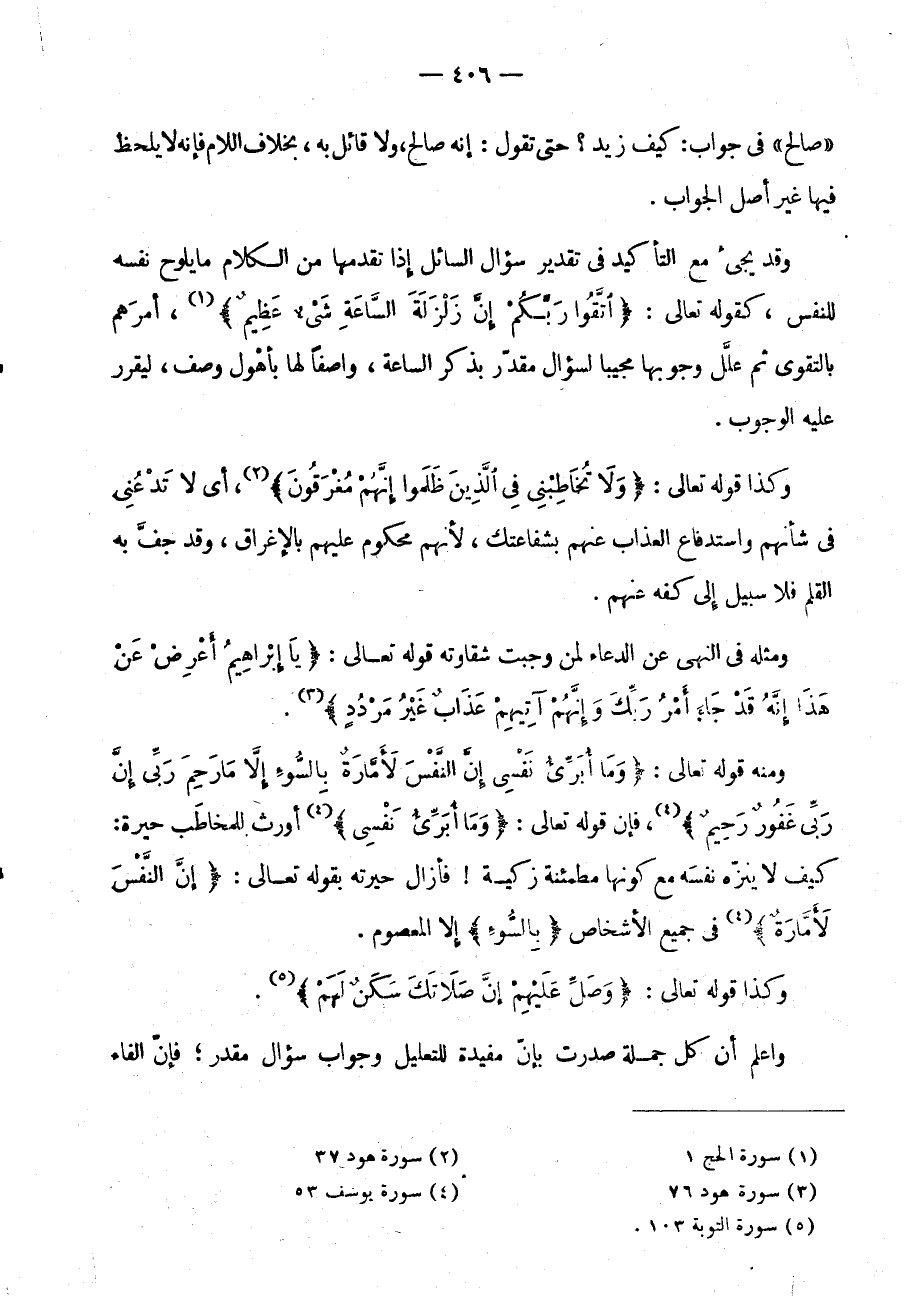 وَمِنْهُ قَوْلُهُ تَعَالَى: {وَمَا أُبَرِّئُ نَفْسِي إِنَّ النَّفْسَ لَأَمَّارَةٌ بِالسُّوءِ إِلَّا مَا رَحِمَ رَبِّي إن ربي غفور رحيم} فَإِنَّ قَوْلَهُ تَعَالَى: {وَمَا أُبَرِّئُ نَفْسِي} أَوْرَثَ لِلْمُخَاطَبِ حَيْرَةً كَيْفَ لَا يُنَزِّهُ نَفْسَهُ مَعَ كَوْنِهَا مُطَمْئِنَةً زَكِيَّةً فَأَزَالَ حَيْرَتَهُ بِقَوْلِهِ تَعَالَى: {إِنَّ النَّفْسَ لَأَمَّارَةٌ} فِي جَمِيعِ الْأَشْخَاصِ {بِالسُّوءِ} إِلَّا الْمَعْصُومَ وَكَذَا قَوْلُهُ تَعَالَى: {وَصَلِّ عَلَيْهِمْ إن صلاتك سكن لهم}