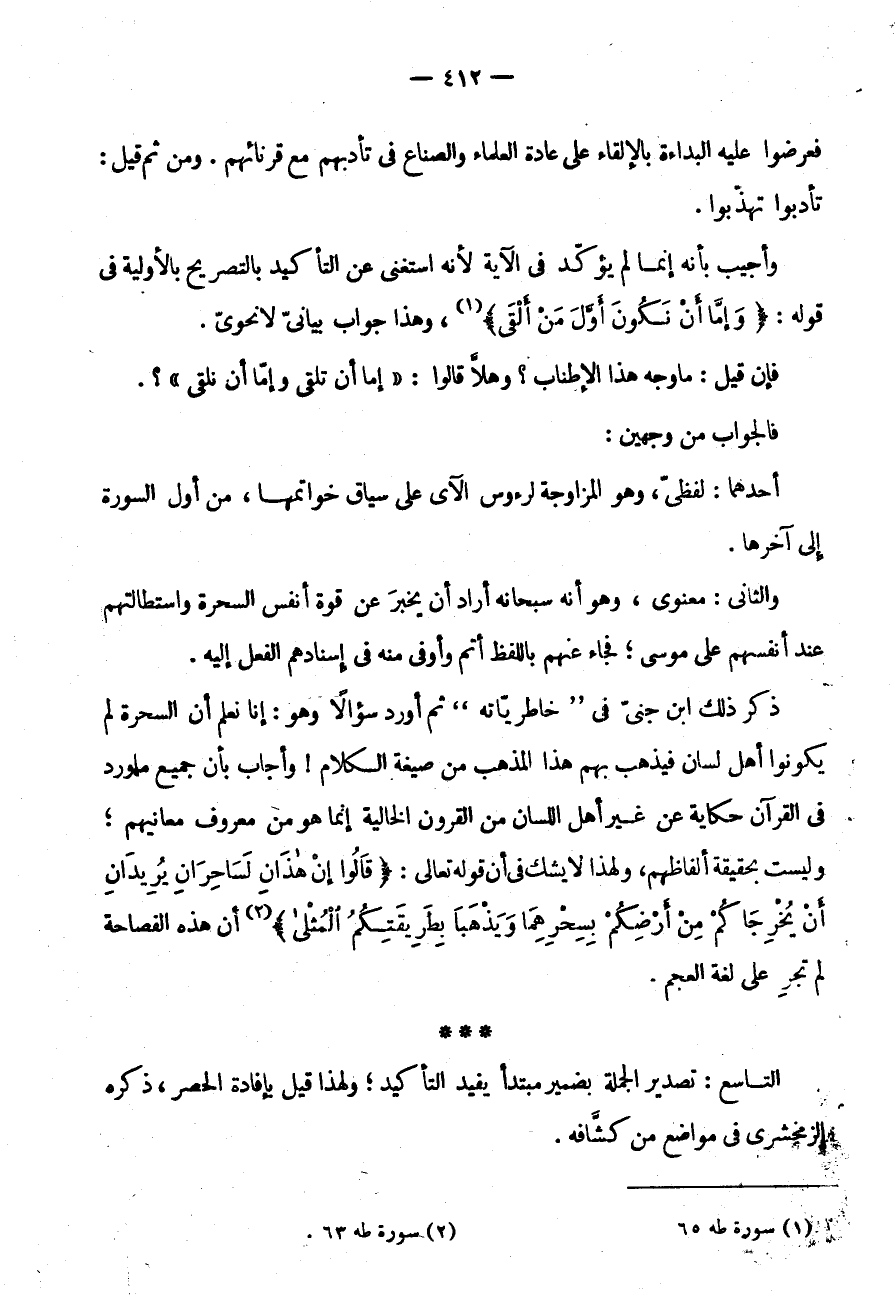 ذَكَرَ ذَلِكَ ابْنُ جِنِّي فِي "خَاطِرَيَاتِهِ" ثُمَّ أَوْرَدَ سُؤَالًا وَهُوَ إِنَّا نَعْلَمُ أَنَّ السَّحَرَةَ لَمْ يَكُونُوا أَهْلَ لِسَانٍ فَيَذْهَبُ بِهِمْ هَذَا الْمَذْهَبُ مِنْ صِيغَةِ الْكَلَامِ! وَأَجَابَ بِأَنَّ جَمِيعَ مَا وَرَدَ فِي الْقُرْآنِ حِكَايَةً عَنْ غَيْرِ أَهْلِ اللِّسَانِ مِنَ الْقُرُونِ الْخَالِيَةِ إِنَّمَا هُوَ مِنْ مَعْرُوفِ مَعَانِيهِمْ وَلَيْسَتْ بِحَقِيقَةِ أَلْفَاظِهِمْ وَلِهَذَا لَا يُشَكُّ فِي أَنَّ قَوْلَهُ تَعَالَى: {قَالُوا إِنْ هَذَانِ لَسَاحِرَانِ يُرِيدَانِ أَنْ يُخْرِجَاكُمْ من أرضكم بسحرهما ويذهبا بطريقتكم المثلى} أَنَّ هَذِهِ الْفَصَاحَةَ لَمْ تَجْرِ عَلَى لُغَةِ الْعَجَمِ