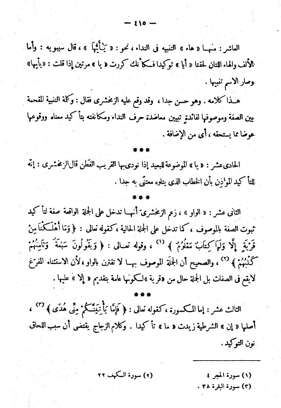 هَذَا كَلَامُهُ وَهُوَ حَسَنٌ جِدًّا وَقَدْ وَقَعَ عَلَيْهِ الزَّمَخْشَرِيُّ فَقَالَ: وَكَلِمَةُ التَّنْبِيهِ الْمُقْحَمَةُ بَيْنَ الصِّفَةِ وَمَوْصُوفِهَا لِفَائِدَةِ تَبْيِينِ مُعَاضَدَةِ حَرْفِ النِّدَاءِ وَمُكَاتَفَتِهِ بِتَأْكِيدِ مَعْنَاهُ وَوُقُوعِهَا عِوَضًا مِمَّا يَسْتَحِقُّهُ أَيْ مِنَ الْإِضَافَةِ