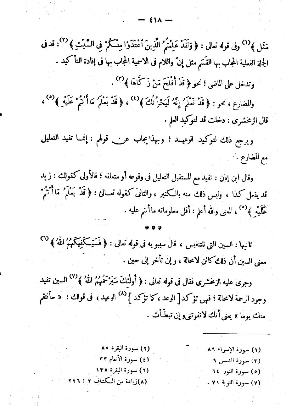 ثانيا: السِّينُ الَّتِي لِلتَّنْفِيسِ قَالَ سِيبَوَيْهِ فِي قَوْلِهِ تعالى: {فسيكفيكهم الله} مَعْنَى السِّينِ: أَنَّ ذَلِكَ كَائِنٌ لَا مَحَالَةَ وَإِنْ تَأَخَّرَ إِلَى حِينٍ