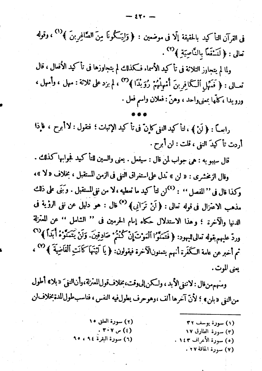 رَابِعًا: "لَنْ" لِتَأْكِيدِ النَّفْيِ كَإِنَّ فِي تَأْكِيدِ الْإِثْبَاتِ فَتَقُولُ: لَا أَبْرَحُ فَإِذَا أَرَدْتَ تَأْكِيدَ النَّفْيِ قُلْتَ: لَنْ أَبْرَحَ قَالَ سِيبَوَيْهِ: هِيَ جَوَابٌ لِمَنْ قَالَ: سَيَفْعَلُ يَعْنِي وَالسِّينُ لِلتَّأْكِيدِ فَجَوَابُهَا كَذَلِكَ وَقَالَ الزَّمَخْشَرِيُّ: لَنْ تَدُلَّ عَلَى اسْتِغْرَاقِ النَّفْيِ فِي الزَّمَنِ الْمُسْتَقْبَلِ بِخِلَافِ "لَا" وَكَذَا قَالَ فِي الْمُفَصَّلِ: "لَنْ" لِتَأْكِيدِ مَا تُعْطِيهِ "لَا" مِنْ نَفْيِ الْمُسْتَقْبَلِ وَبُنِيَ عَلَى ذَلِكَ مَذْهَبُ الِاعْتِزَالِ فِي قَوْلِهِ تَعَالَى: {لَنْ تراني} قَالَ: هُوَ دَلِيلٌ عَنْ نَفْيِ الرُّؤْيَةِ فِي الدُّنْيَا وَالْآخِرَةِ وَهَذَا الِاسْتِدْلَالُ حَكَاهُ إِمَامُ الْحَرَمَيْنِ فِي الشَّامِلِ عَنِ الْمُعْتَزِلَةِ وَرَدَّ عَلَيْهِمْ بِقَوْلِهِ تَعَالَى لِلْيَهُودِ: {فَتَمَنَّوُا الْمَوْتَ إِنْ كُنْتُمْ صَادِقِينَ. ولن يتمنوه أبدا} ثُمَّ أَخْبَرَ عَنْ عَامَّةِ الْكَفَرَةِ أَنَّهُمْ يَتَمَنَّوْنَ الآخرة فيقولون: {يا ليتها كانت القاضية} يَعْنِي: الْمَوْتَ