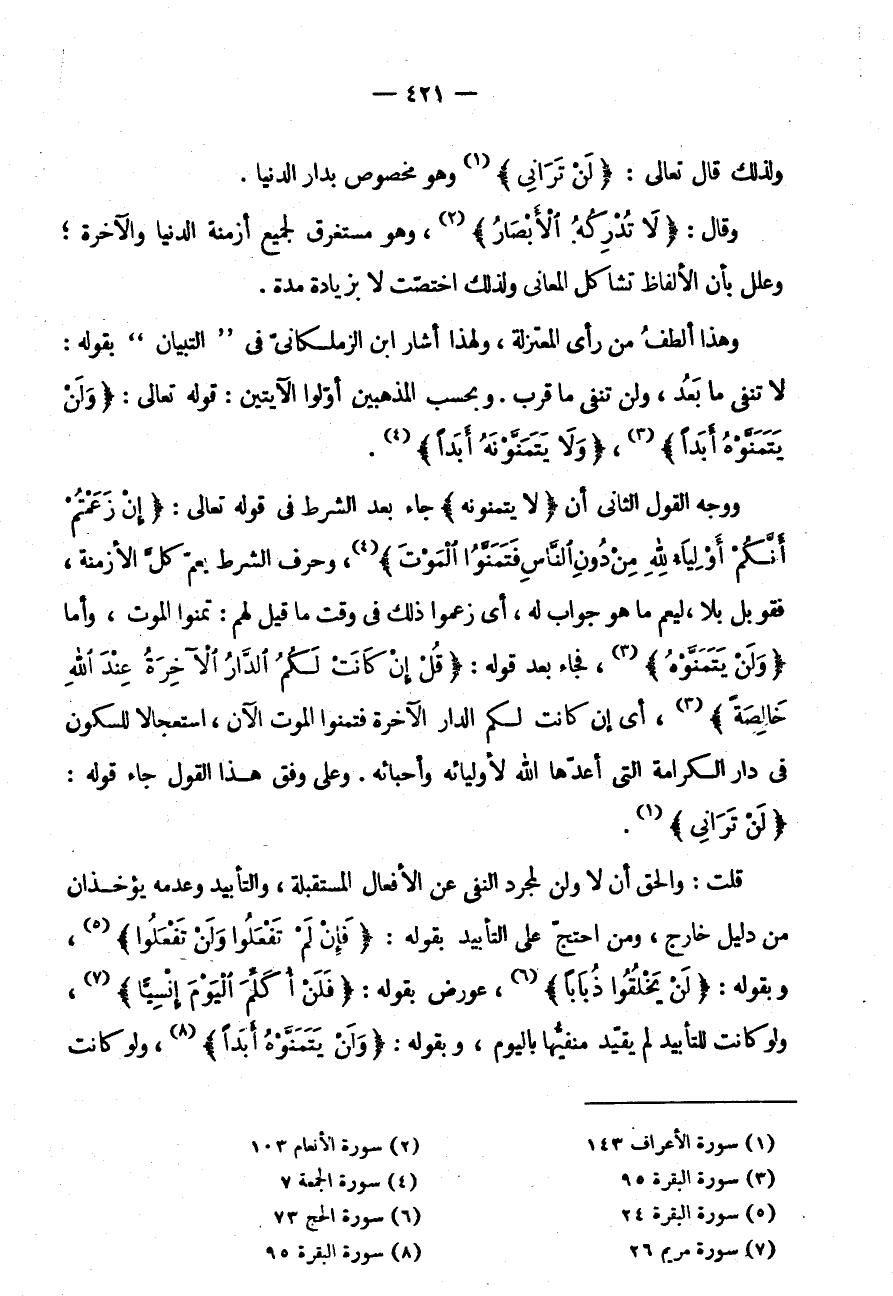 وَقَالَ: {لَا تُدْرِكُهُ الأبصار} وَهُوَ مُسْتَغْرِقٌ لِجَمِيعِ أَزْمِنَةِ الدُّنْيَا وَالْآخِرَةِ وَعَلَّلَ بِأَنَّ الْأَلْفَاظَ تُشَاكِلُ الْمَعَانِيَ وَلِذَلِكَ اخْتُصَّتْ لَا بِزِيَادَةِ مُدَّةٍ