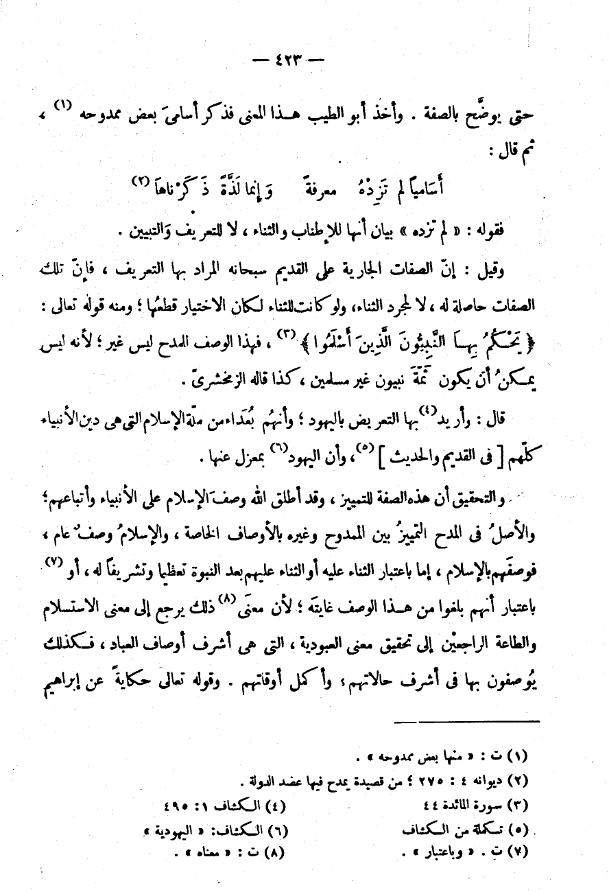 وَقِيلَ: إِنَّ الصِّفَاتِ الْجَارِيَةَ عَلَى الْقَدِيمِ سُبْحَانَهُ الْمُرَادُ بِهَا التَّعْرِيفُ فَإِنَّ تِلْكَ الصِّفَاتِ حَاصِلَةٌ لَهُ لَا لِمُجَرَّدِ الثَّنَاءِ وَلَوْ كَانَتْ لِلثَّنَاءِ لَكَانَ الِاخْتِيَارُ قَطْعَهَا وَمِنْهُ قَوْلُهُ تَعَالَى: {يَحْكُمُ بِهَا النَّبِيُّونَ الَّذِينَ أَسْلَمُوا} فَهَذَا الْوَصْفُ لِلْمَدْحِ لَيْسَ غَيْرُ لِأَنَّهُ لَيْسَ يُمْكِنُ أَنْ يَكُونَ ثَمَّةَ نَبِيُّونَ غَيْرَ مُسْلِمِينَ كَذَا قَالَهُ الزَّمَخْشَرِيُّ قَالَ: وَأُرِيدَ بِهَا التَّعْرِيضُ باليهود وأنهم بعداء من ملة اإسلام التي هي دين الأنبياء كلهم في القديم والحديث وَأَنَّ الْيَهُودَ بِمَعْزِلٍ عَنْهَا