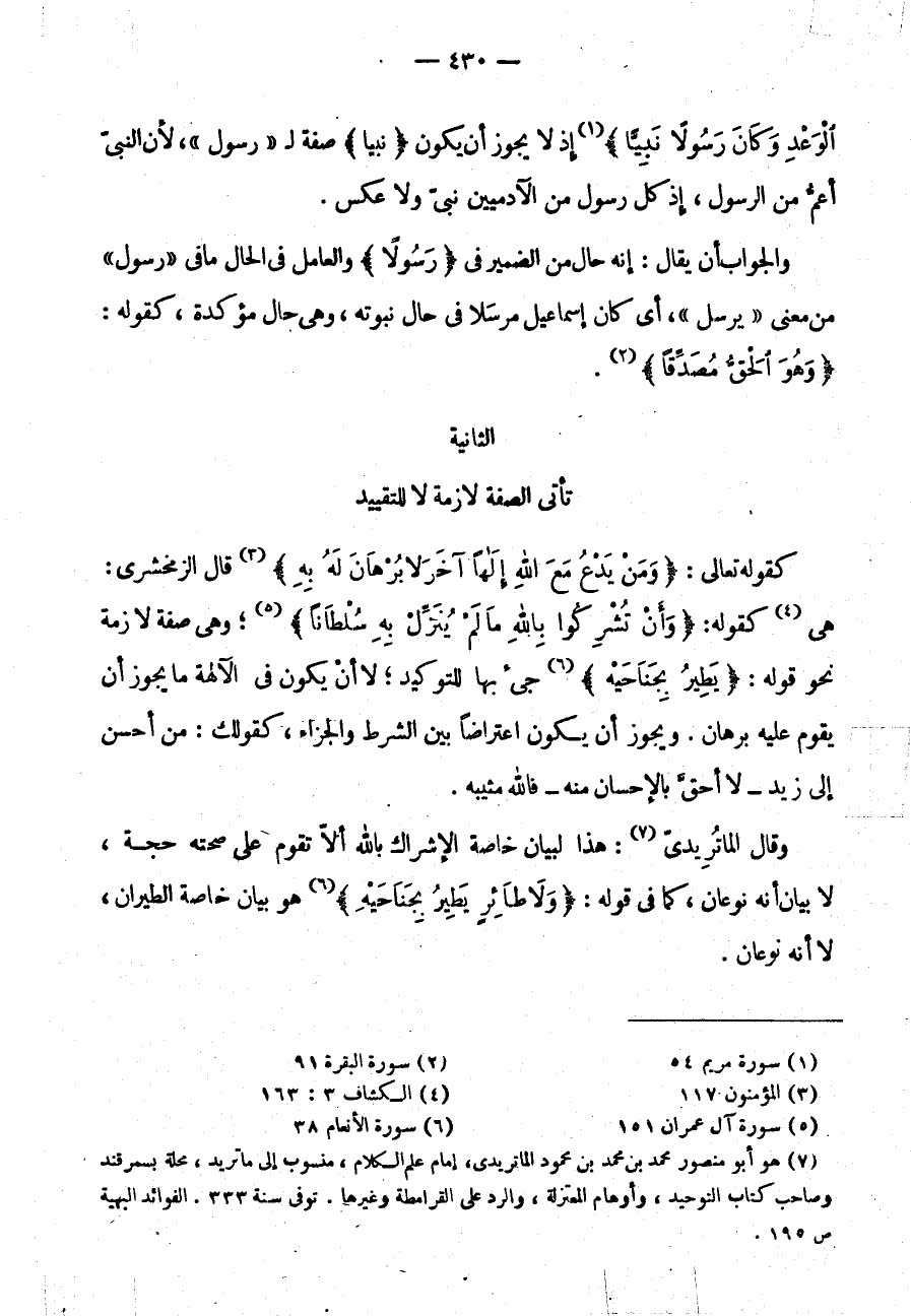 وَقَالَ الْمَاتُرِيدِيُّ: هَذَا لِبَيَانِ خَاصَّةِ الْإِشْرَاكِ بِاللَّهِ أَلَّا تَقُومَ عَلَى صِحَّتِهِ حُجَّةٌ لَا بَيَانُ أَنَّهُ نَوْعَانِ كَمَا فِي قَوْلِهِ: {وَلَا طائر يطير بجناحيه} هُوَ بَيَانُ خَاصَّةِ الطَّيَرَانِ لَا أَنَّهُ نَوْعَانِ
