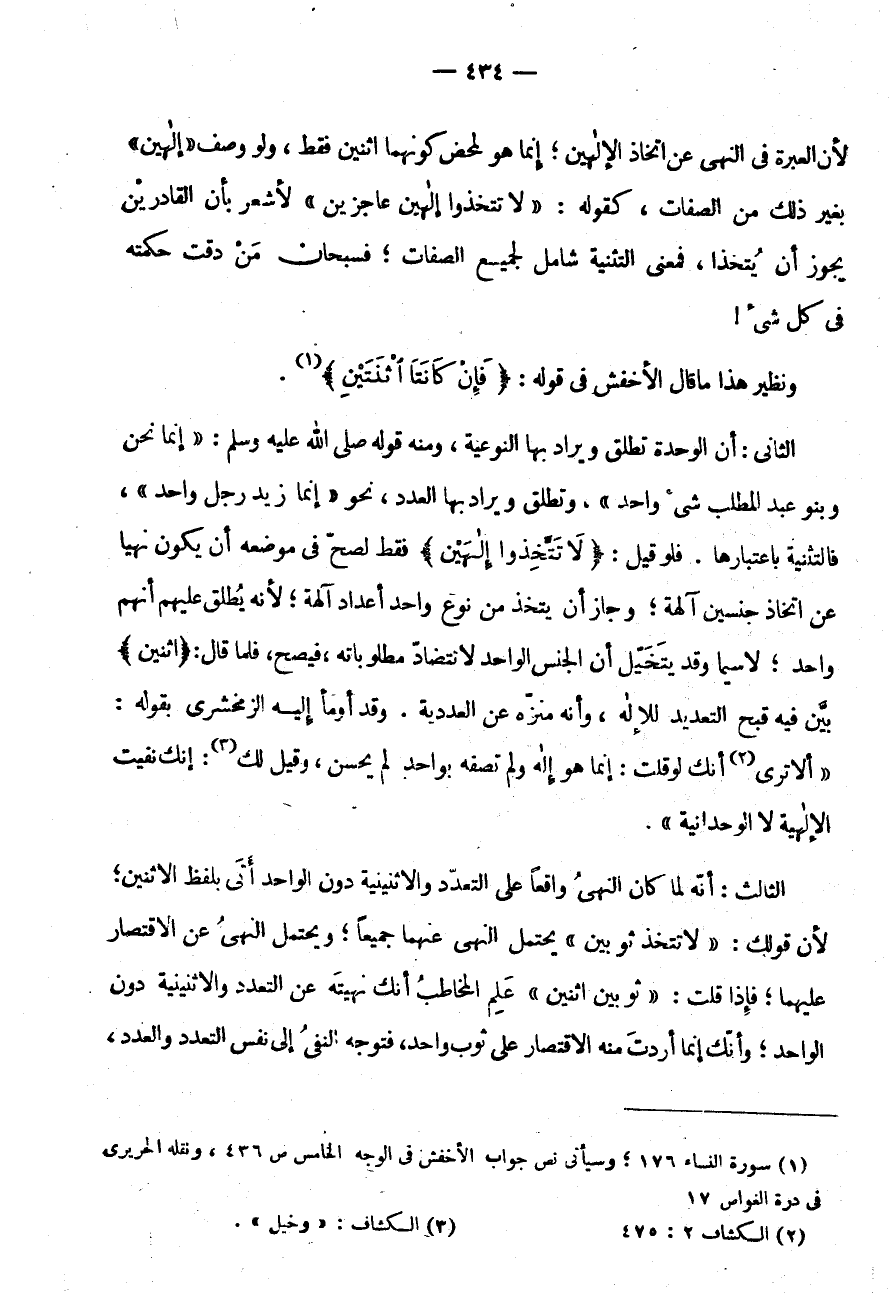الثَّانِي: أَنَّ الْوَحْدَةَ تُطْلَقُ وَيُرَادُ بِهَا النَّوْعِيَّةُ وَمِنْهُ قَوْلُهُ صَلَّى اللَّهُ عَلَيْهِ وَسَلَّمَ: "إِنَّمَا نَحْنُ وَبَنُو عَبْدِ الْمُطَّلِبِ شَيْءٌ وَاحِدٌ" وَتُطْلَقُ وَيُرَادُ بِهَا الْعَدَدُ نَحْوَ: "إِنَّمَا زَيْدٌ رَجُلٌ وَاحِدٌ" فَالتَّثْنِيَةُ بِاعْتِبَارِهَا فَلَوْ قِيلَ: {لَا تَتَّخِذُوا إِلَهَيْنِ} فَقَطْ لَصَحَّ فِي مَوْضُوعِهِ أَنْ يَكُونَ نَهْيًا عَنِ اتِّخَاذِ جِنْسَيْنِ آلِهَةً وَجَازَ أَنْ يُتَّخَذَ مِنْ نَوْعٍ وَاحِدٍ أَعْدَادُ آلِهَةٍ لِأَنَّهُ يطلق عليهم أنهم واحد لاسيما وَقَدْ يُتَخَيَّلُ أَنَّ الْجِنْسَ الْوَاحِدَ لَا تَتَضَادُّ مَطْلُوبَاتُهُ فَيَصِحُّ فَلَمَّا قَالَ: {اثْنَيْنِ} بَيَّنَ فِيهِ قُبْحَ التَّعْدِيدِ لِلْإِلَهِ وَأَنَّهُ مُنَزَّهٌ عَنِ الْعَدَدِيَّةِ وقد أومأ إليه الزمخشري بقوله: أَلَا تَرَى أَنَّكَ لَوْ قُلْتَ: إِنَّمَا هُوَ إِلَهٌ وَلَمْ تَصِفْهُ بِوَاحِدٍ لَمْ يَحْسُنْ وَقِيلَ لَكَ إِنَّكَ نَفَيْتَ الْإِلَهِيَّةَ لَا الْوَحْدَانِيَّةَ الثَّالِثُ: أَنَّهُ لَمَّا كَانَ النَّهْيُ وَاقِعًا عَلَى التَّعَدُّدِ وَالِاثْنَيْنِيَّةِ دُونَ الْوَاحِدِ أَتَى بِلَفْظِ الِاثْنَيْنِ لِأَنَّ قَوْلَكَ: لَا تَتَّخِذْ ثَوْبَيْنِ يَحْتَمِلُ النَّهْيَ عَنْهُمَا جَمِيعًا وَيَحْتَمِلُ النَّهْيَ عَنِ الِاقْتِصَارِ عَلَيْهِمَا فَإِذَا قُلْتَ: ثَوْبَيْنِ اثْنَيْنِ عَلِمَ الْمُخَاطَبُ أَنَّكَ نَهَيْتَهُ عَنِ التَّعَدُّدِ وَالِاثْنَيْنِيَّةِ دُونَ الْوَاحِدِ وَأَنَّكَ إِنَّمَا أَرَدْتَ مِنْهُ الِاقْتِصَارَ عَلَى ثَوْبٍ وَاحِدٍ فَتَوَجَّهَ النَّفْيُ إِلَى نَفْسِ التَّعَدُّدِ وَالْعَدَدِ