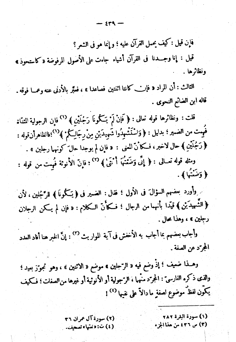 وَأَجَابَ بَعْضُهُمْ بِمَا أَجَابَ بِهِ الْأَخْفَشُ فِي آيَةِ الْمَوَارِيثِ: إِنَّ الْخَبَرَ هُنَا أَفَادَ الْعَدَدَ الْمُجَرَّدَ عَنِ الصِّفَةِ وَهَذَا ضَعِيفٌ إِذْ وَضَعَ فِيهِ "الرَّجُلَيْنِ" مَوْضِعَ الِاثْنَيْنِ وَهُوَ تَجَوُّزٌ بَعِيدٌ وَالَّذِي ذَكَرَهُ الْفَارِسِيُّ الْمُجَرَّدُ مِنْهُمَا الرُّجُولِيَّةُ أَوِ الْأُنُوثِيَّةُ أَوْ غَيْرُهَا مِنَ الصِّفَاتِ فَكَيْفَ يَكُونُ لَفْظٌ مَوْضُوعٌ لِصِفَةٍ مَا دَالًّا عَلَى نَفْيِهَا!