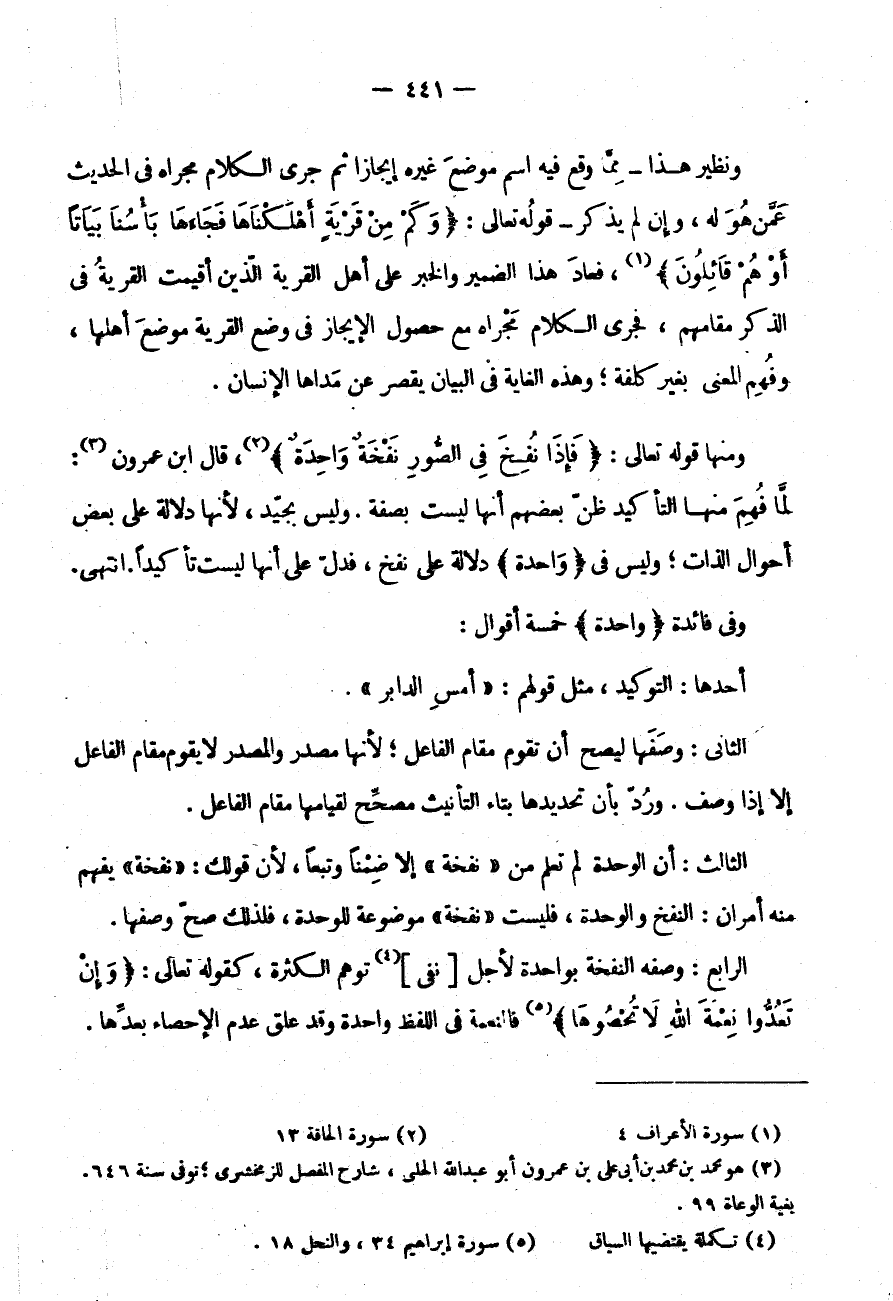 الثَّالِثُ: أَنَّ الْوَحْدَةَ لَمْ تُعْلَمْ مِنْ نَفْخَةٍ إِلَّا ضِمْنًا وَتَبَعًا لِأَنَّ قَوْلَكَ نَفْخَةٌ يُفْهَمُ مِنْهُ أَمْرَانِ النَّفْخُ وَالْوَحْدَةُ فَلَيْسَتْ نَفْخَةٌ مَوْضُوعَةً لِلْوَحْدَةِ فَلِذَلِكَ صَحَّ وَصْفُهَا