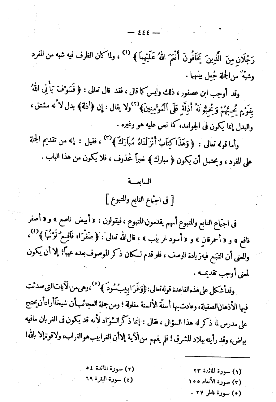 وَأَمَّا قَوْلُهُ تَعَالَى: {وَهَذَا كتاب أنزلناه مبارك} فَقِيلَ: إِنَّهُ مِنْ تَقْدِيمِ الْجُمْلَةِ عَلَى الْمُفْرَدِ وَيُحْتَمَلُ أَنْ يَكُونَ {مُبَارَكٌ} خَبَرًا لِمَحْذُوفٍ فَلَا يَكُونُ مِنْ هَذَا الْبَابِ