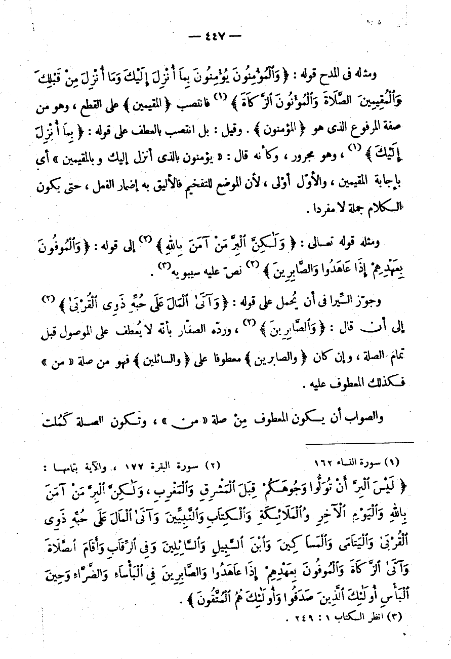 وَجَوَّزَ السِّيرَافِيُّ أَنْ يُحْمَلَ عَلَى قَوْلِهِ: {وَآتَى الْمَالَ عَلَى حُبِّهِ ذَوِي القربى} إِلَى أَنْ قَالَ: {وَالصَّابِرِينَ} وَرَدَّهُ الصَّفَّارُ بِأَنَّهُ لَا يُعْطَفُ عَلَى الْمَوْصُولِ قَبْلَ تَمَامِ الصِّلَةِ وَإِنْ كَانَ {وَالصَّابِرِينَ} مَعْطُوفًا عَلَى {وَالسَّائِلِينَ} فَهُوَ مِنْ صِلَةِ " مَنْ " فَكَذَلِكَ الْمَعْطُوفُ عَلَيْهِ