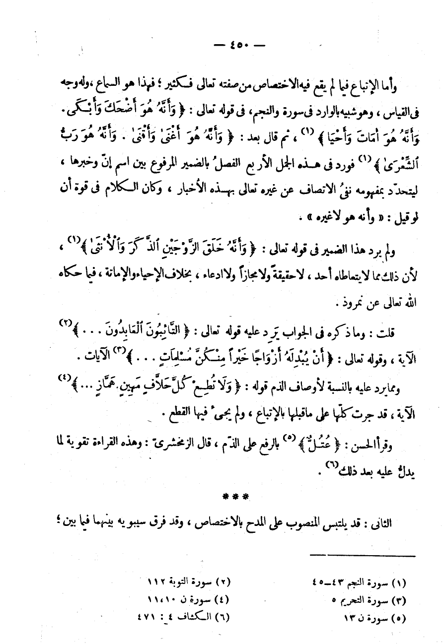 وَأَمَّا الْإِتْبَاعُ فِيمَا لَمْ يَقَعْ فِيهِ الِاخْتِصَاصُ مِنْ صِفَتِهِ تَعَالَى فَكَثِيرٌ فَهَذَا هُوَ السَّمَاعُ وَلَهُ وَجْهٌ فِي الْقِيَاسِ وَهُوَ شَبِيهٌ بِالْوَارِدِ فِي سُورَةِ وَالنَّجْمِ فِي قَوْلِهِ تَعَالَى: {وَأَنَّهُ هُوَ أَضْحَكَ وَأَبْكَى. وَأَنَّهُ هُوَ أَمَاتَ وَأَحْيَا} ثُمَّ قَالَ بَعْدُ: {وَأَنَّهُ هُوَ أَغْنَى وَأَقْنَى. وأنه هو رب الشعرى} فَوَرَدَ فِي هَذِهِ الْجُمَلِ الْأَرْبَعِ الْفَصْلُ بِالضَّمِيرِ الْمَرْفُوعِ بَيْنَ اسْمِ إِنَّ وَخَبَرِهَا لِيَتَحَدَّدَ بِمَفْهُومِهِ نَفْيُ الِاتِّصَافِ عَنْ غَيْرِهِ تَعَالَى بِهَذِهِ الْأَخْبَارِ وَكَانَ الْكَلَامُ فِي قُوَّةِ أَنْ لَوْ قِيلَ: " وَأَنَّهُ هُوَ لَا غَيْرُهُ " وَلَمْ يَرِدْ هَذَا الضَّمِيرُ فِي قَوْلِهِ تَعَالَى: {وَأَنَّهُ خَلَقَ الزَّوْجَيْنِ الذكر والأنثى} لِأَنَّ ذَلِكَ مِمَّا لَا يَتَعَاطَاهُ أَحَدٌ لَا حَقِيقَةً وَلَا مَجَازًا وَلَا ادِّعَاءً بِخِلَافِ الْإِحْيَاءِ وَالْإِمَاتَةِ فِيمَا حَكَاهُ اللَّهُ تَعَالَى عَنْ نُمْرُوذَ