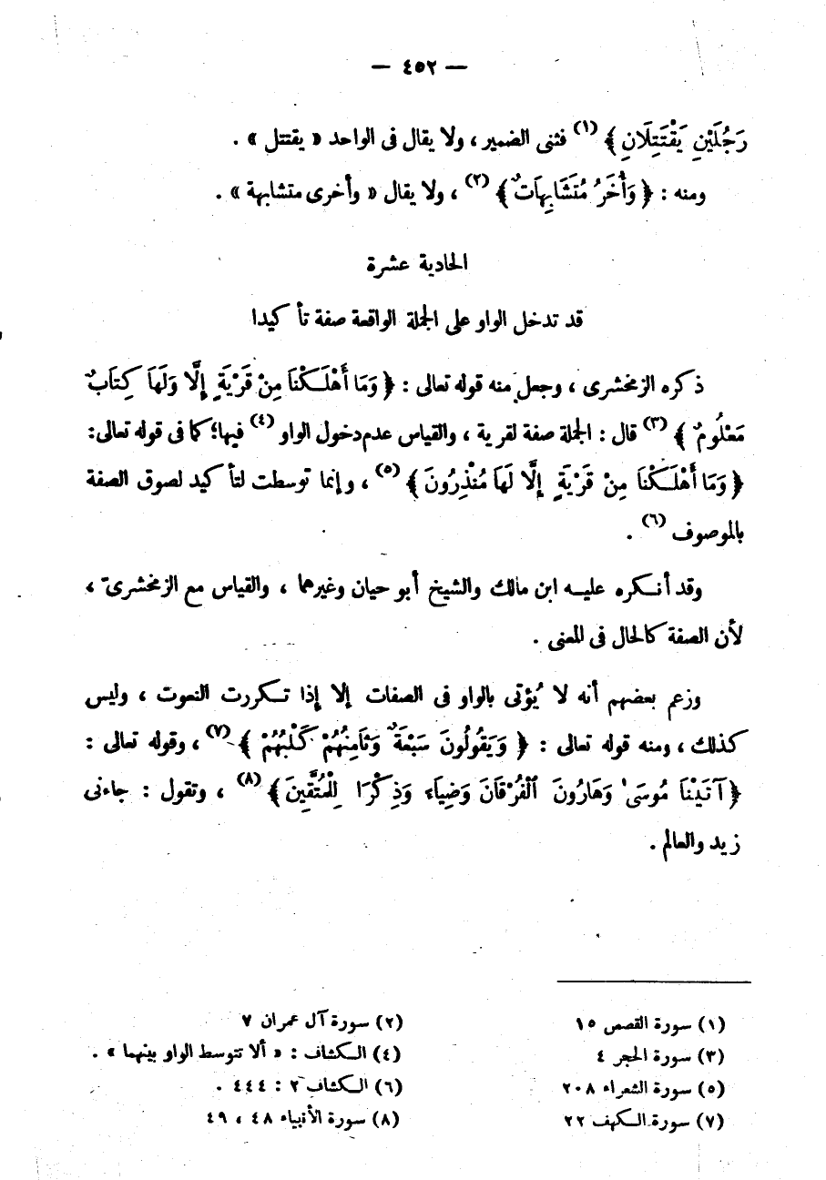 وَقَدْ أَنْكَرَهُ عَلَيْهِ ابْنُ مَالِكٍ وَالشَّيْخُ أَبُو حَيَّانَ وَغَيْرُهُمَا وَالْقِيَاسُ مَعَ الزَّمَخْشَرِيِّ لِأَنَّ الصِّفَةَ كَالْحَالِ فِي الْمَعْنَى وَزَعَمَ بَعْضُهُمْ أَنَّهُ لَا يُؤْتَى بِالْوَاوِ فِي الصِّفَاتِ إِلَّا إِذَا تَكَرَّرَتِ النُّعُوتُ وَلَيْسَ كَذَلِكَ وَمِنْهُ قَوْلُهُ تَعَالَى: {وَيَقُولُونَ سَبْعَةٌ وثامنهم كلبهم} وَقَوْلُهُ تَعَالَى: {آتَيْنَا مُوسَى وَهَارُونَ الْفُرْقَانَ وَضِيَاءً وَذِكْرًا لِلْمُتَّقِينَ} وَتَقُولُ: جَاءَنِي زَيْدٌ وَالْعَالِمُ