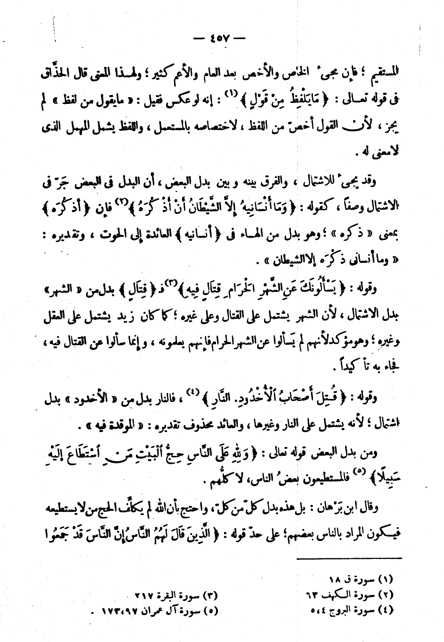 وَقَوْلِهِ: {يَسْأَلُونَكَ عن الشهر الحرام قتال فيه} فَـ {قِتَالٍ} بَدَلٌ مِنَ "الشَّهْرِ " بَدَلَ الِاشْتِمَالِ لِأَنَّ الشَّهْرَ يَشْتَمِلُ عَلَى الْقِتَالِ وَعَلَى غَيْرِهِ كَمَا كَانَ زَيْدٌ يَشْتَمِلُ عَلَى الْعَقْلِ وَغَيْرِهِ وَهُوَ مُؤَكِّدٌ لِأَنَّهُمْ لَمْ يَسْأَلُوا عَنِ الشَّهْرِ الْحَرَامِ فَإِنَّهُمْ يَعْلَمُونَهُ وَإِنَّمَا سَأَلُوا عَنِ الْقِتَالِ فِيهِ فَجَاءَ بِهِ تَأْكِيدًا