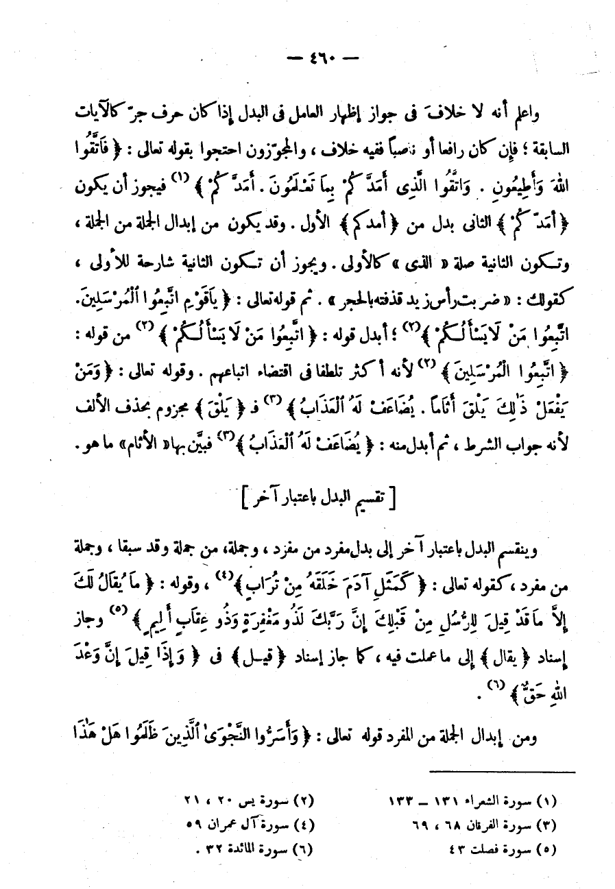 وَاعْلَمْ أَنَّهُ لَا خِلَافَ فِي جَوَازِ إِظْهَارِ الْعَامِلِ فِي الْبَدَلِ إِذَا كَانَ حَرْفَ جَرٍّ كَالْآيَاتِ السَّابِقَةِ فَإِنْ كَانَ رَافِعًا أَوْ نَاصِبًا فَفِيهِ خِلَافٌ وَالْمُجَوِّزُونَ احْتَجُّوا بِقَوْلِهِ تَعَالَى: {فَاتَّقُوا اللَّهَ وَأَطِيعُونِ. وَاتَّقُوا الَّذِي أَمَدَّكُمْ بِمَا تَعْلَمُونَ. أمدكم} يجوز أَنْ يَكُونَ {أَمَدَّكُمُ} الثَّانِي بَدَلًا مَنْ {أَمَدَّكُمْ} الْأَوَّلِ وَقَدْ يَكُونُ مِنْ إِبْدَالِ الْجُمْلَةِ مِنَ الْجُمْلَةِ وَتَكُونُ الثَّانِيَةُ صِلَةَ " الَّذِي " كَالْأُولَى وَيَجُوزُ أَنْ تَكُونَ الثَّانِيَةُ شَارِحَةً لِلْأُولَى كَقَوْلِكَ ضَرَبْتُ رَأْسَ زَيْدٍ قَذَفْتُهُ بِالْحَجَرِ ثُمَّ قَوْلُهُ تَعَالَى: {يَاقَوْمِ اتَّبِعُوا الْمُرْسَلِينَ. اتَّبِعُوا مَنْ لَا يَسْأَلُكُمْ} أبدل قوله: {اتبعوا من لا يسألكم} من قوله: {اتبعوا المرسلين} لِأَنَّهُ أَكْثَرُ تَلَطُّفًا فِي اقْتِضَاءِ اتِّبَاعِهِمْ وَقَوْلُهُ تَعَالَى: {وَمَنْ يَفْعَلْ ذَلِكَ يَلْقَ أَثَامًا. يُضَاعَفْ له العذاب} فَـ {يَلْقَ} مَجْزُومٌ بِحَذْفِ الْأَلِفِ لِأَنَّهُ جَوَابُ الشَّرْطِ ثُمَّ أُبْدِلَ مِنْهُ {يُضَاعَفْ لَهُ الْعَذَابُ} فبين بها الأثام ما هو