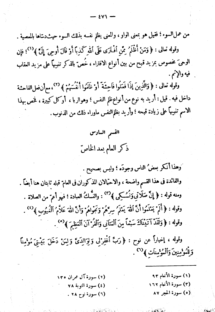 وَالْفَائِدَةُ فِي هَذَا الْقِسْمِ وَاضِحَةٌ وَالِاحْتِمَالَانِ الْمَذْكُورَانِ فِي الْعَامِّ قَبْلَهُ ثَابِتَانِ هُنَا أَيْضًا وَمِنْهُ قَوْلُهُ: {إِنَّ صلاتي ونسكي} وَالنُّسُكُ الْعِبَادَةُ فَهُوَ أَعَمُّ مِنَ الصَّلَاةِ