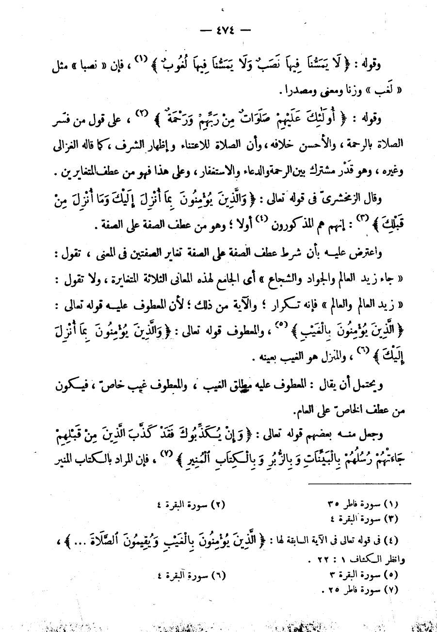 وَقَوْلِهِ: {لَا يَمَسُّنَا فِيهَا نَصَبٌ وَلَا يَمَسُّنَا فِيهَا لُغُوبٌ} فَإِنَّ "نَصَبٌ" مِثْلُ "لَغَبٍ" وَزْنًا وَمَعْنًى وَمَصْدَرًا وَقَوْلِهِ: {أُولَئِكَ عَلَيْهِمْ صَلَوَاتٌ مِنْ ربهم ورحمة} عَلَى قَوْلِ مَنْ فَسَّرَ الصَّلَاةَ بِالرَّحْمَةِ وَالْأَحْسَنُ خِلَافُهُ وَأَنَّ الصَّلَاةَ لِلِاعْتِنَاءِ وَإِظْهَارِ الشَّرَفِ كَمَا قَالَهُ الْغَزَالِيُّ وَغَيْرُهُ وَهُوَ قَدْرٌ مُشْتَرَكٌ بَيْنَ الرَّحْمَةِ وَالدُّعَاءِ وَالِاسْتِغْفَارِ وَعَلَى هَذَا فَهُوَ مِنْ عَطْفِ الْمُتَغَايِرَيْنِ