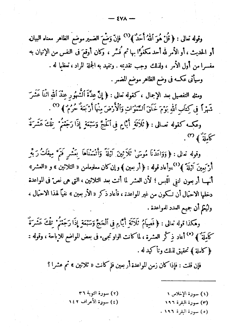 وَقَوْلِهِ تَعَالَى: {وَوَاعَدْنَا مُوسَى ثَلَاثِينَ لَيْلَةً وَأَتْمَمْنَاهَا بِعَشْرٍ فَتَمَّ ميقات ربه أربعين ليلة} وَأَعَادَ قَوْلَهُ: {أَرْبَعِينَ} وَإِنْ كَانَ مَعْلُومًا مِنَ الثلاثين والعشر أَنَّهَا أَرْبَعُونَ لِنَفْيِ اللَّبْسِ لِأَنَّ الْعَشْرَ لَمَّا أَتَتْ بَعْدَ الثَّلَاثِينِ الَّتِي هِيَ نَصٌّ فِي الْمُوَاعَدَةِ دَخَلَهَا الِاحْتِمَالُ أَنْ تَكُونَ مِنْ غَيْرِ الْمُوَاعَدَةِ فَأَعَادَ ذِكْرَ الْأَرْبَعِينِ نَفْيًا لِهَذَا الِاحْتِمَالِ وَلِيُعْلَمَ أَنَّ جَمِيعَ الْعَدَدِ لِلْمُوَاعَدَةِ