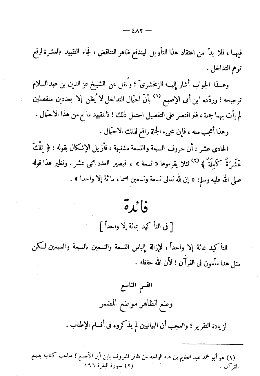 فِيهِمَا فَلَا بُدَّ مِنَ اعْتِقَادِ هَذَا التَّأْوِيلِ لِيَنْدَفِعَ ظَاهِرُ التَّنَاقُضِ فَجَاءَ التَّقْيِيدُ بِالْعَشَرَةِ لِرَفْعِ تَوَهُّمِ التَّدَاخُلِ وَهَذَا الْجَوَابُ أَشَارَ إِلَيْهِ الزَّمَخْشَرِيُّ وَنُقِلَ عَنِ الشَّيْخِ عِزِّ الدِّينِ بْنِ عَبْدِ السلام ترجيحه وردده ابن أبي الإصبع بأن احْتِمَالَ التَّدَاخُلِ لَا يُظَنُّ إِلَّا بِعَدَدَيْنِ مُنْفَصِلَيْنِ لَمْ يَأْتِ بِهِمَا جُمْلَةً فَلَوِ اقْتَصَرَ عَلَى التَّفْصِيلِ احْتَمَلَ ذَلِكَ فَالتَّقْيِيدُ مَانِعٌ مِنْ هَذَا الِاحْتِمَالِ