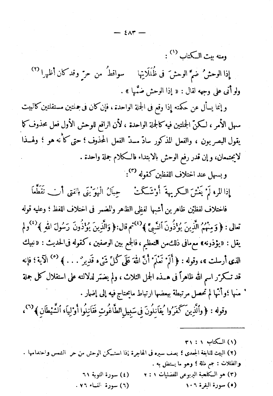 وَإِنَّمَا يُسْأَلُ عَنْ حِكْمَتِهِ إِذَا وَقَعَ فِي الْجُمْلَةِ الْوَاحِدَةِ فَإِنْ كَانَ فِي جُمْلَتَيْنِ مُسْتَقِلَّتَيْنِ كَالْبَيْتِ سَهُلَ الْأَمْرُ لَكِنَّ الْجُمْلَتَيْنِ فِيهِ كَالْجُمْلَةِ الْوَاحِدَةِ لِأَنَّ الرَّافِعَ لِلْوَحْشِ الْأَوَّلِ فِعْلٌ مَحْذُوفٌ كَمَا يَقُولُ الْبَصْرِيُّونَ وَالْفِعْلُ الْمَذْكُورُ سَادٌّ مَسَدَّ الْفِعْلِ الْمَحْذُوفِ حَتَّى كَأَنَّهُ هُوَ وَلِهَذَا لَا يَجْتَمِعَانِ وَإِنْ قُدِّرَ رَفْعُ الْوَحْشِ بِالِابْتِدَاءِ فَالْكَلَامُ جُمْلَةٌ وَاحِدَةٌ