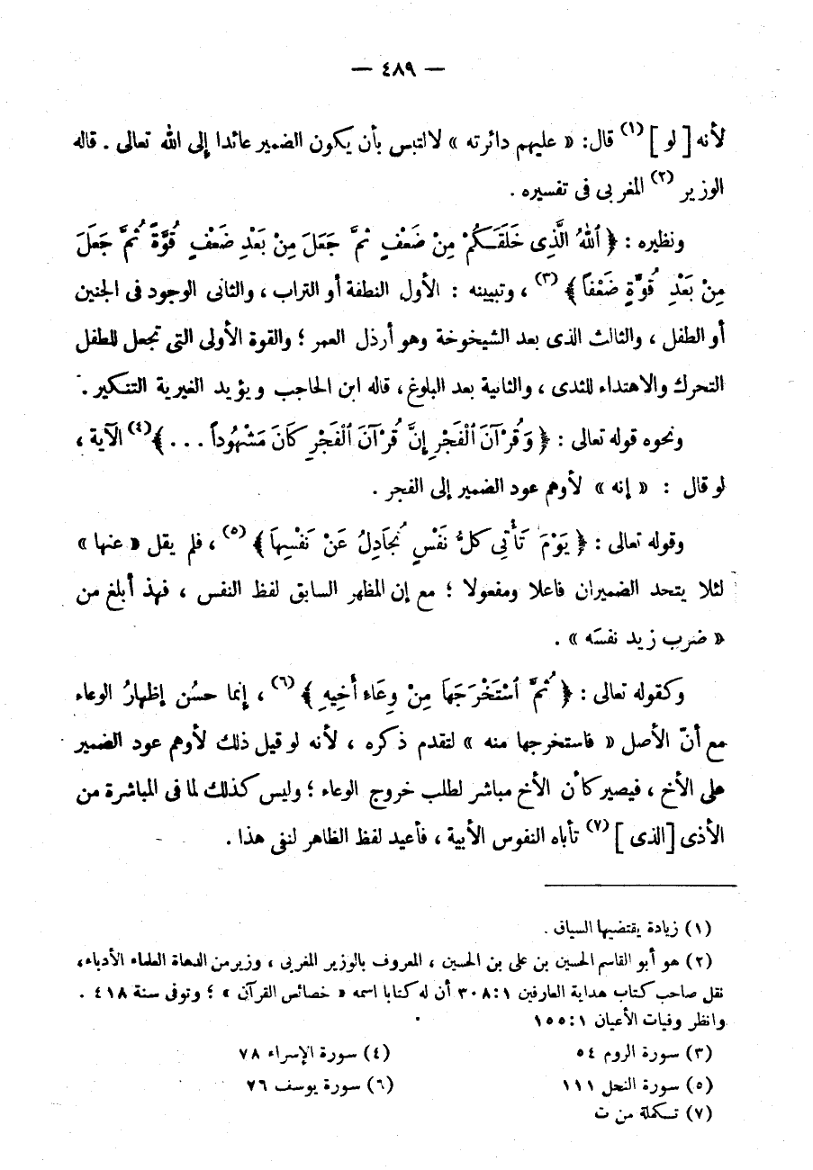 ونحوه قَوْلِهِ تَعَالَى: {وَقُرْآنَ الْفَجْرِ إِنَّ قُرْآنَ الْفَجْرِ كان مشهودا} الْآيَةَ لَوْ قَالَ: "إِنَّهُ" لَأَوْهَمَ عَوْدَ الضَّمِيرِ إِلَى الْفَجْرِ